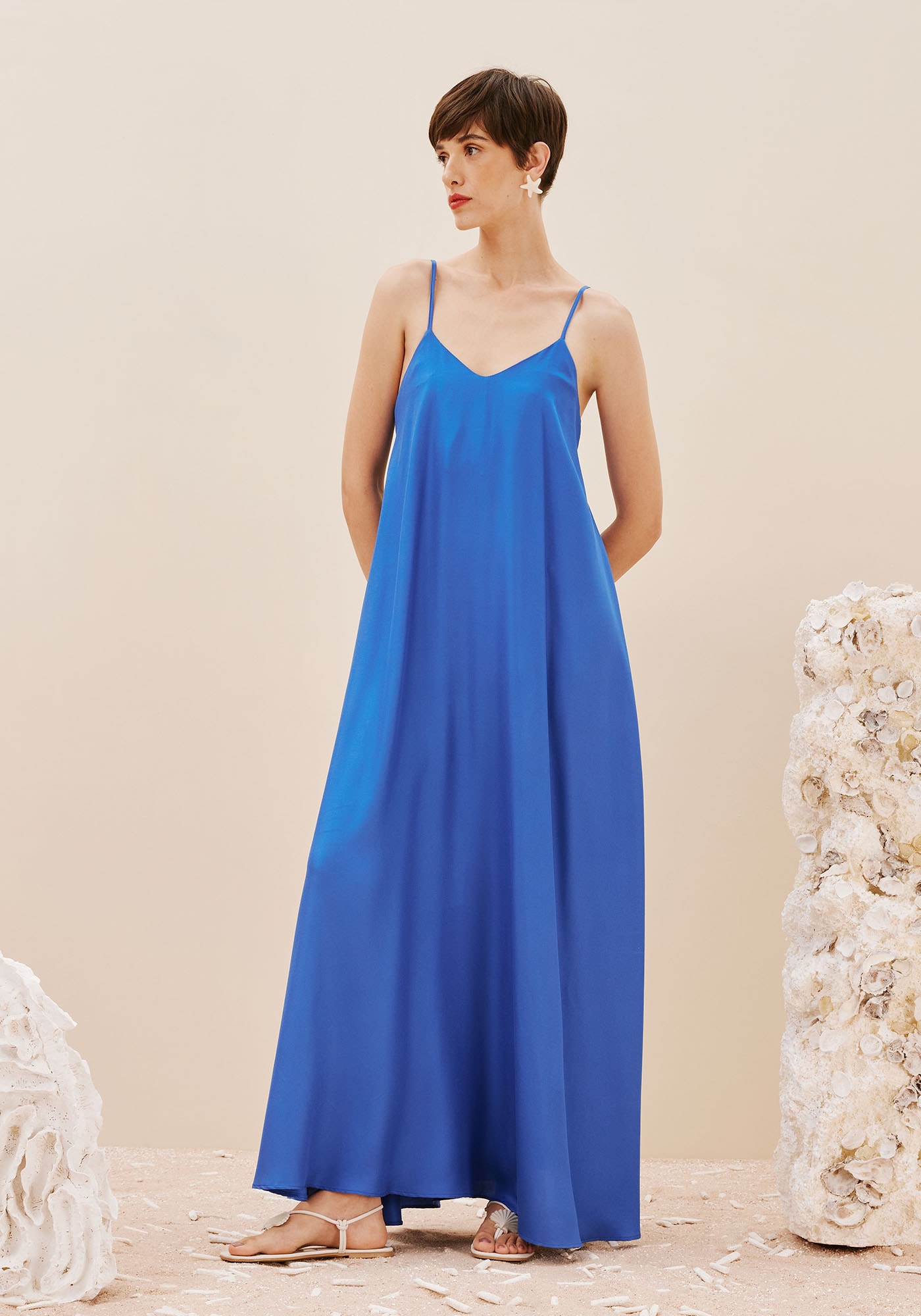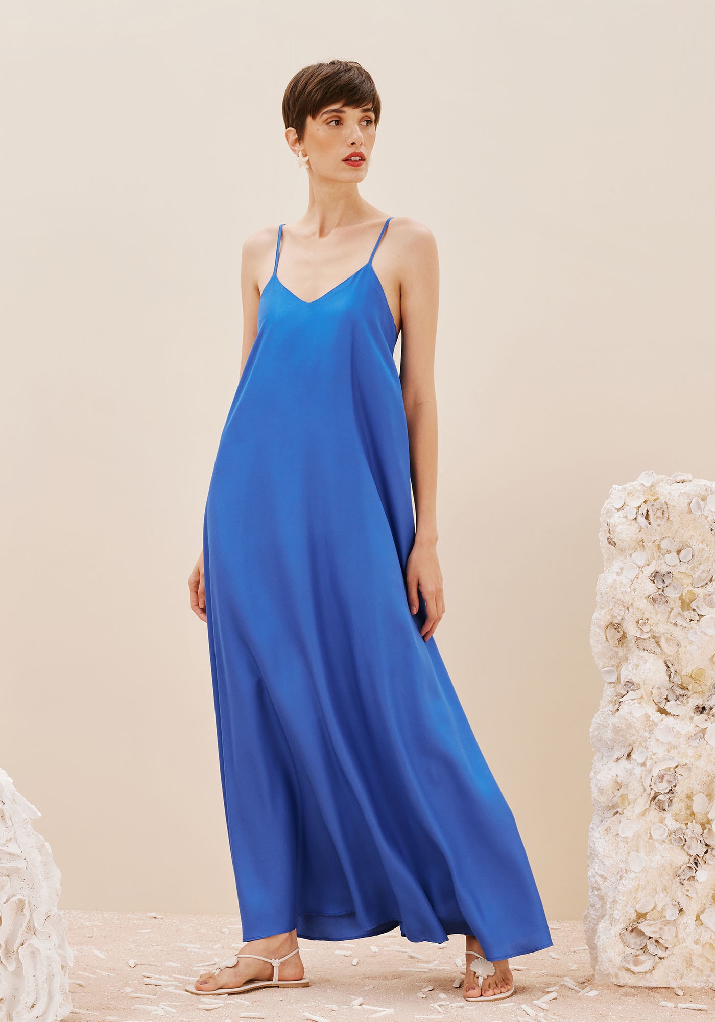Confeccionado em tecido 100% viscose, o vestido liso ésofisticado e elegante. Com shape solto e fluído, o modelo de alcinha possui o detalhe charmoso do taco nas costas.