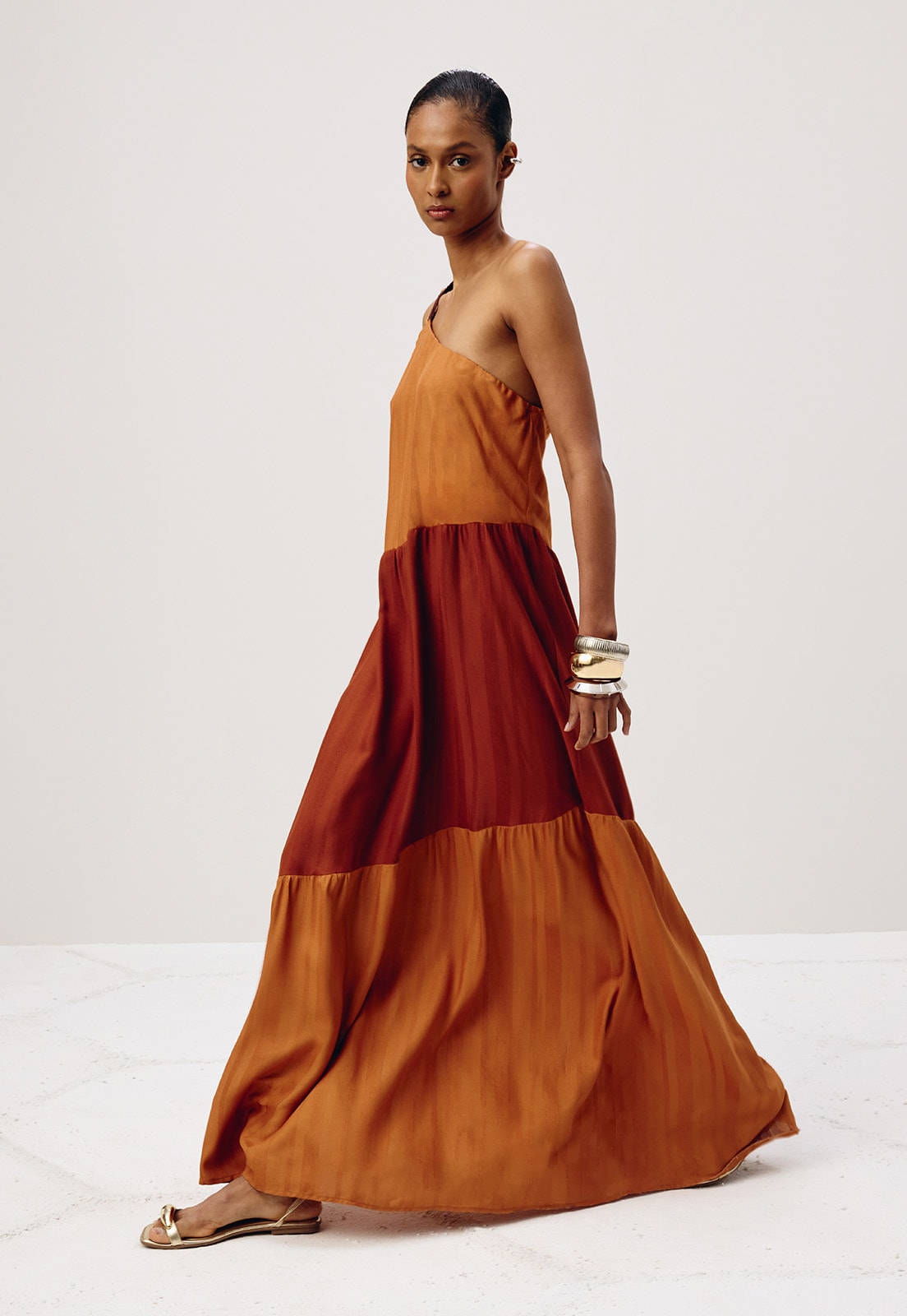 Com design elegante e toque artesanal, esse vestido longo traz o equilíbrio ideal entre sofisticação e leveza. Possui decote assimétrico com alças trançadas duplas que valorizam o colo e trazem um detalhe diferenciado ao visual. A modelagem ampla com recortes em blocos de cor (caramelo e telha) cria movimento e alonga a silhueta com fluidez, Confeccionado em tecido leve e respirável, mistura de 97% viscose e 3% linho, garante conforto térmico e caimento suave no corpo. A saia ampla em camadas reforça o efeito esvoaçante, tornando essa peça uma escolha versátil para o dia a dia ou ocasiões especiais.