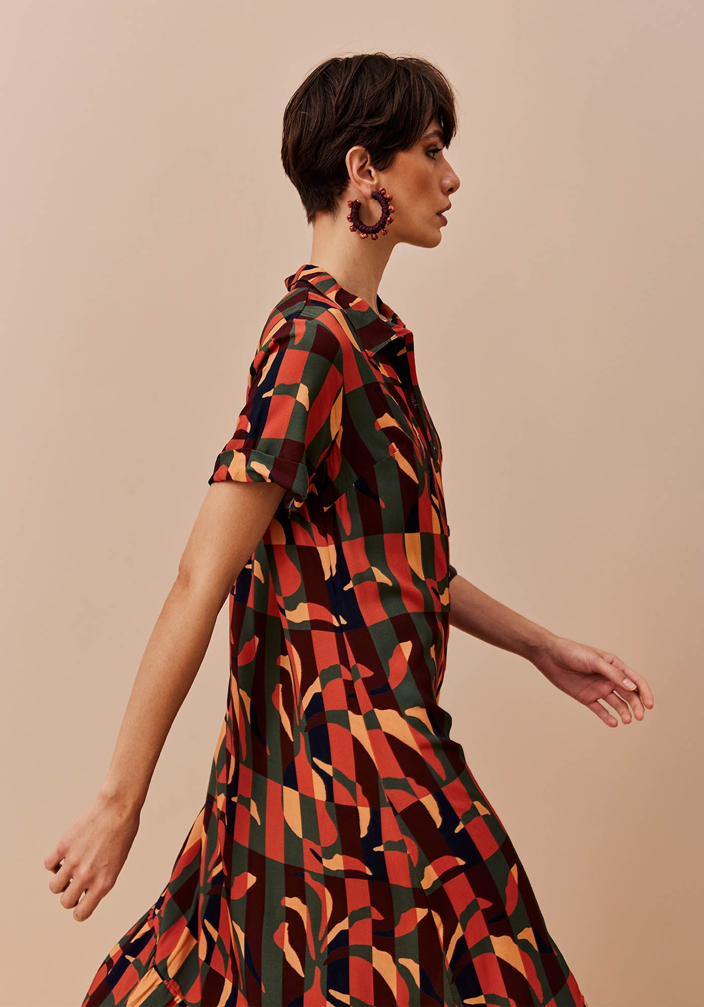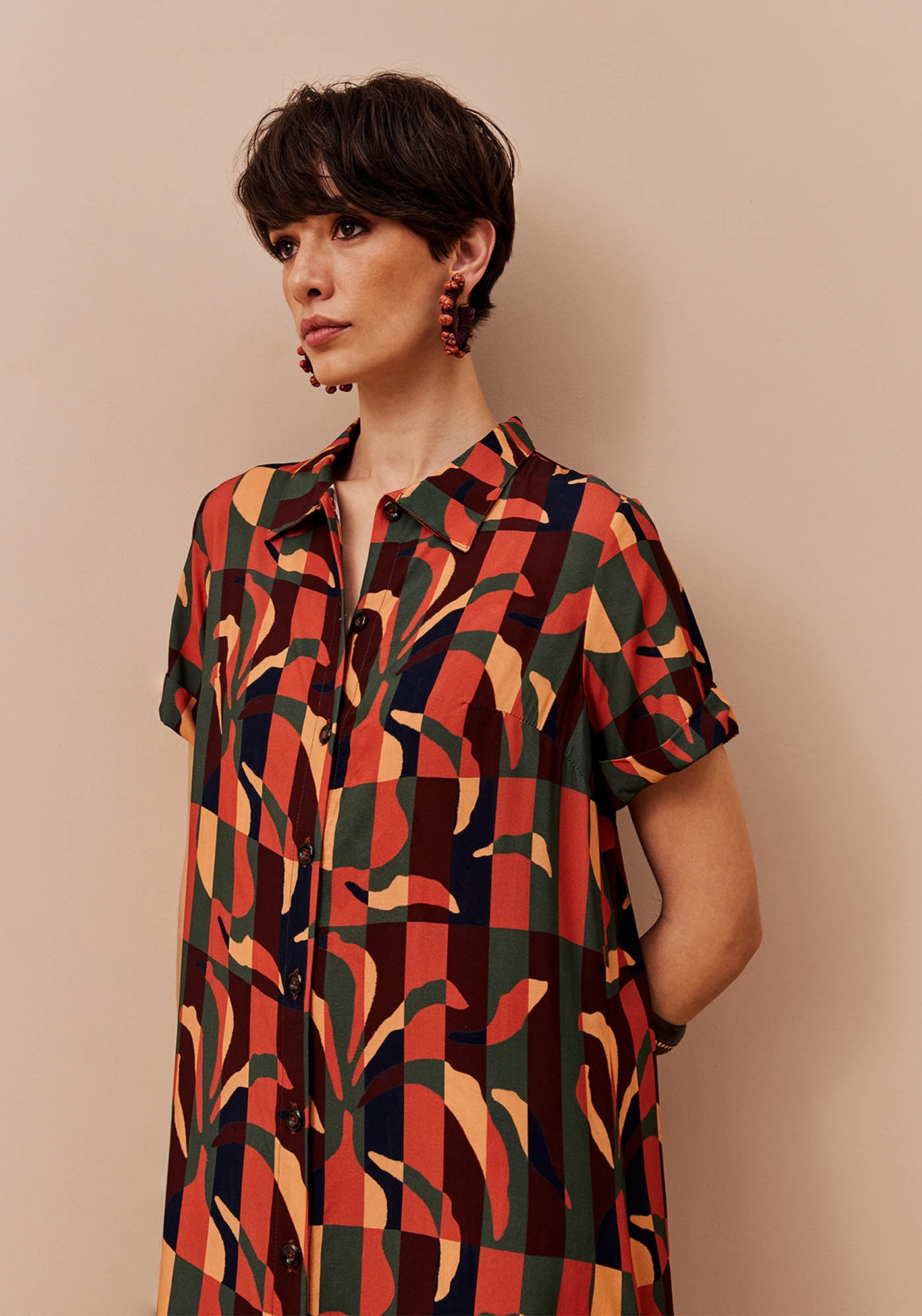 O vestido estampado Ayasana é confeccionado em tecido 100% viscose. O modelo possui manga curta com gola e abotoamento frontal. O detalhe do babado na barra dá mais movimento à peça.