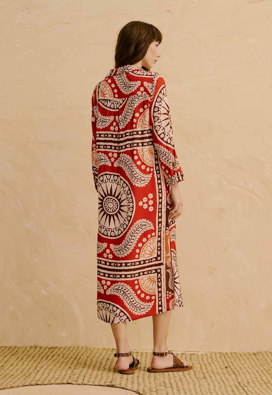O Vestido Chemise Estampado Incaica da CaCay tem modelagem midi com caimento fluido e elegante. A peça veste com leveza, proporcionando conforto e movimento. O comprimento é ideal para quem busca sofisticação no dia a dia. A forma é grande. Se estiver em dúvida entre dois tamanhos, recomendamos optar pelo menor, sempre conferindo a tabela de medidas. A modelo tem 1,75 m, veste manequim 36 e está usando o tamanho P.