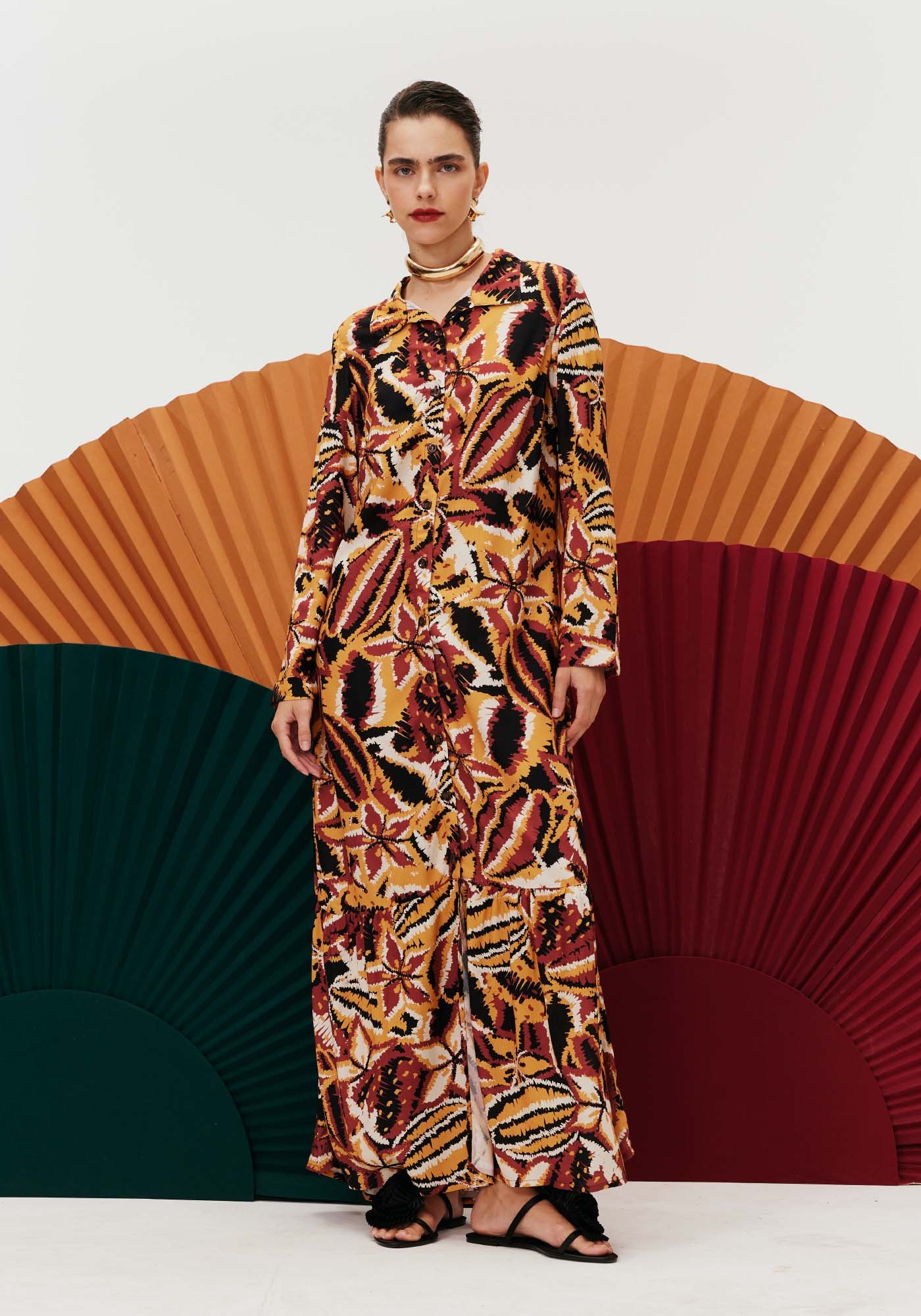 O vestido estilochemise transmite conforto e versatilidade. O modelo possui abotoamento frontalcom botão tartaruga, manga longa e gola, podendo ser usado como chemise, terceira peçaou parte de cima para compor um look.