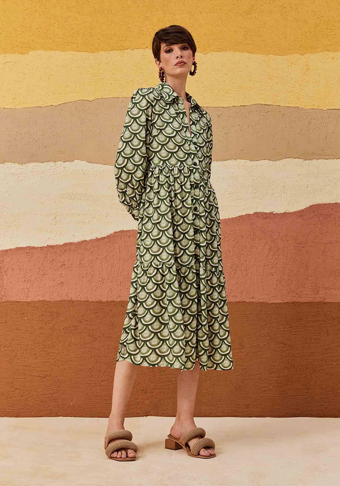 O Vestido Chemise Maxi Midi é a escolha perfeita para quembusca sofisticação. A maria na barra e a manga longabufante adicionam um toque romântico e feminino à peça, enquanto a estampa emtons de verde El Sol traz um visual único. Confeccionadoem 100% Viscose, oferece leveza, sendo idealpara ocasiões tanto formais quanto descontraídas, onde o estilo e o conforto seunem perfeitamente.