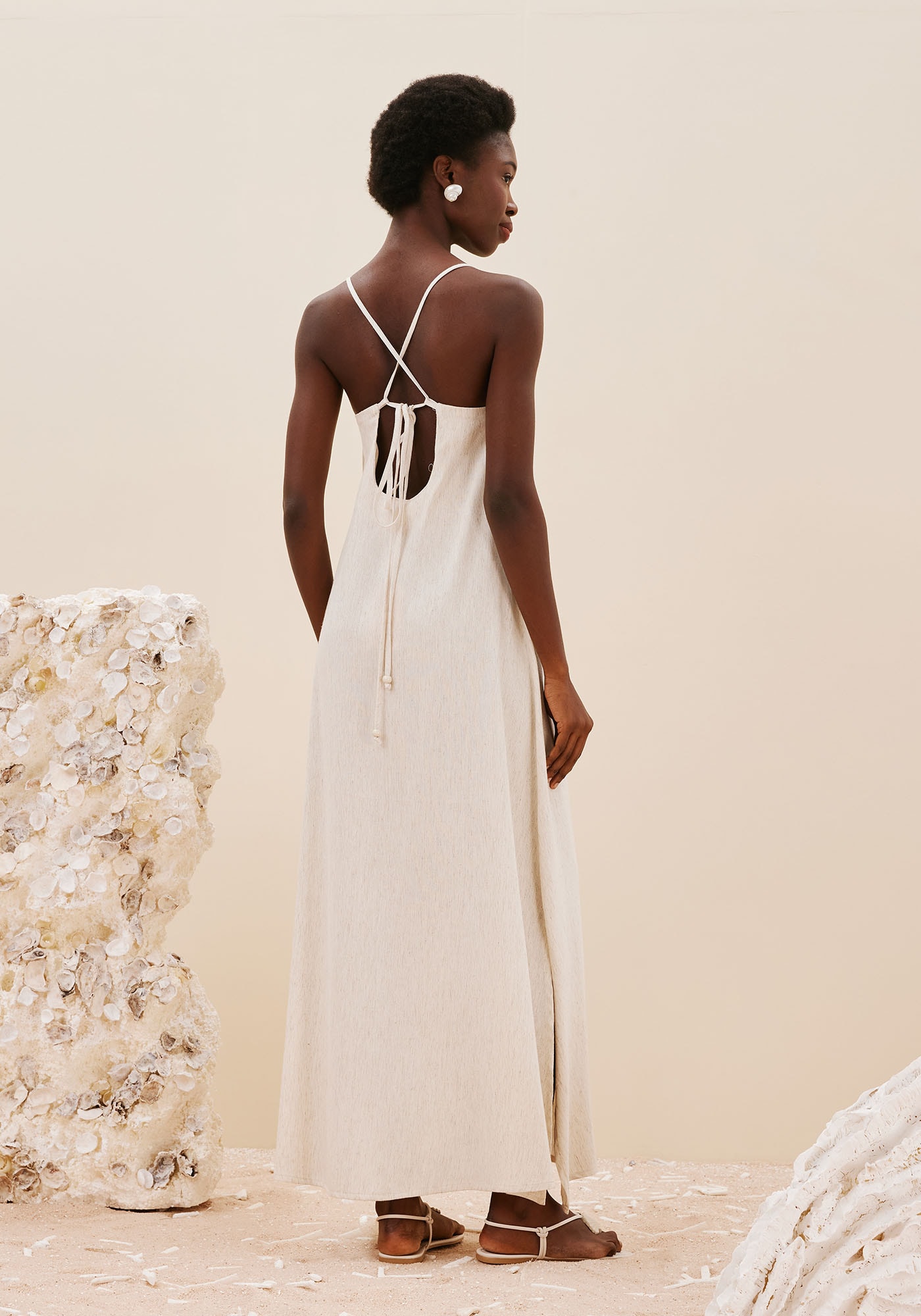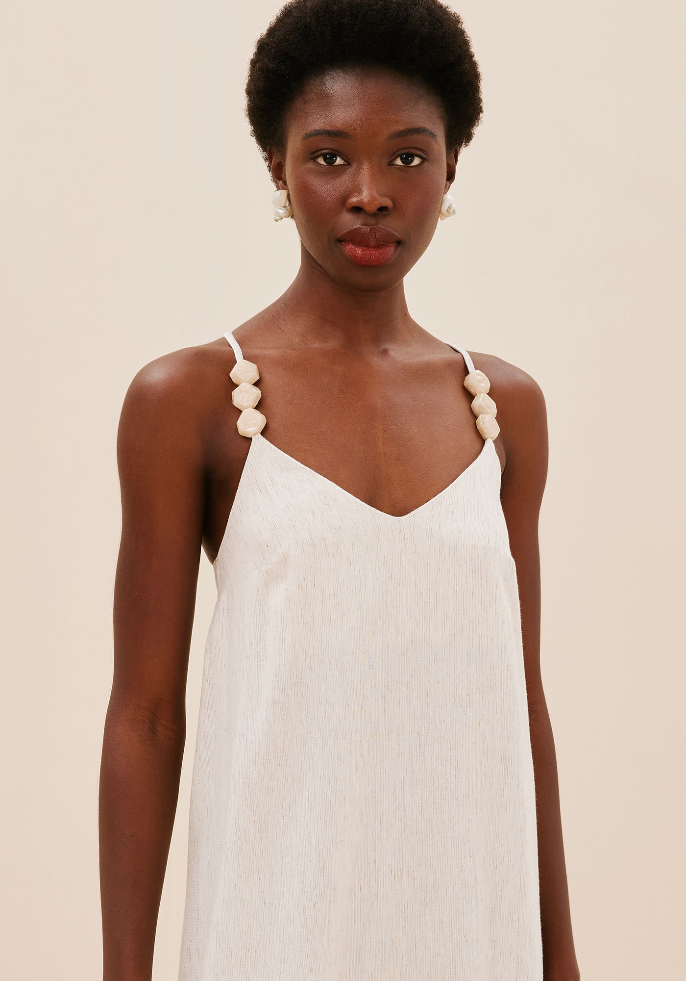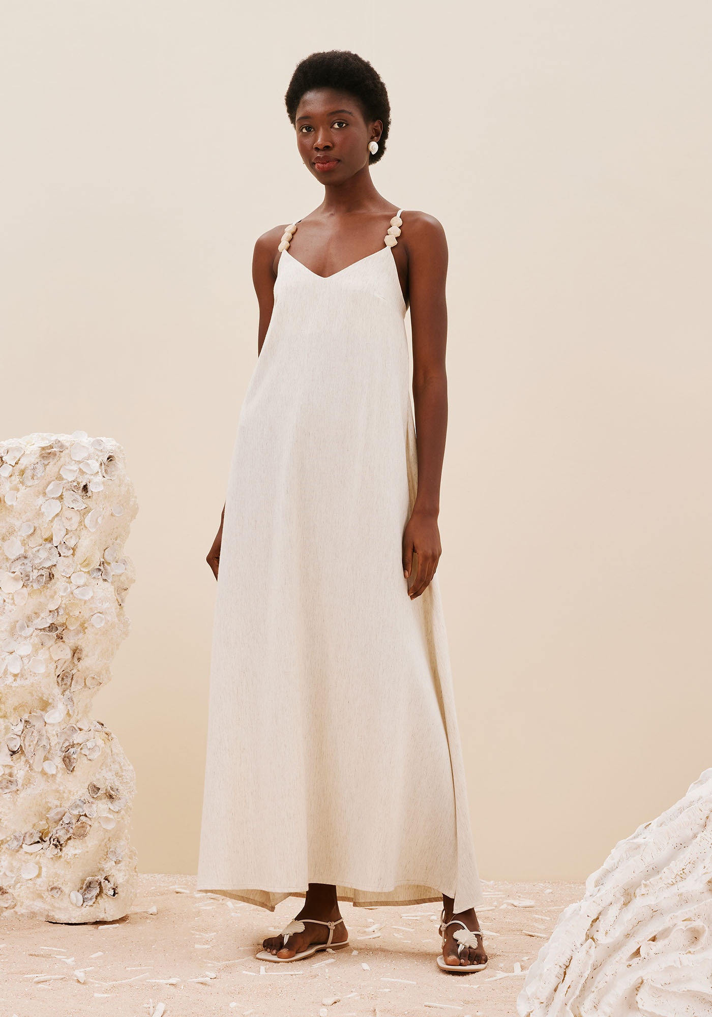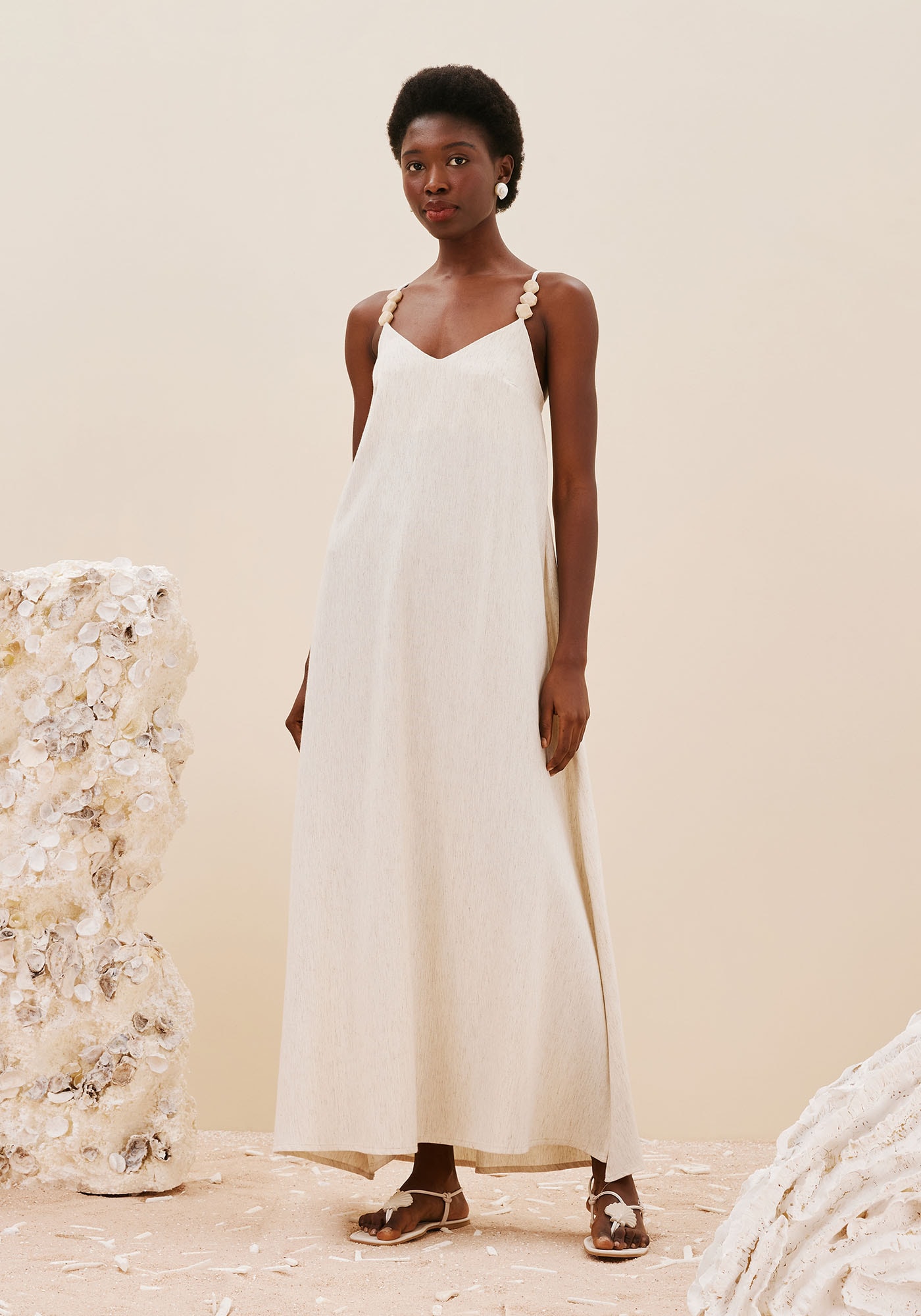 Este vestido longo é sinônimo deelegância e sofisticação, com suas alças finas adornadas com contas queconferem um toque único e artesanal. A modelagem ampla e fluida com fendaslaterais garante liberdade de movimento e proporciona um visual leve e fluido,enquanto a amarração cruzada nas costas adiciona um detalhe charmoso além deoferecer um ajuste personalizado ao corpo. É confeccionado em tecido decomposição 50% Algodão 29% Viscose 15% Modal 6% Linho.