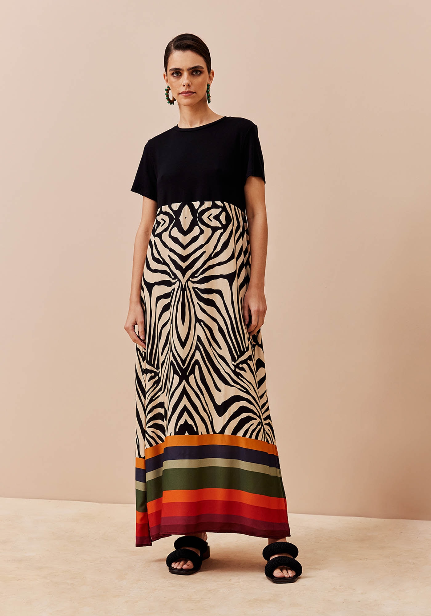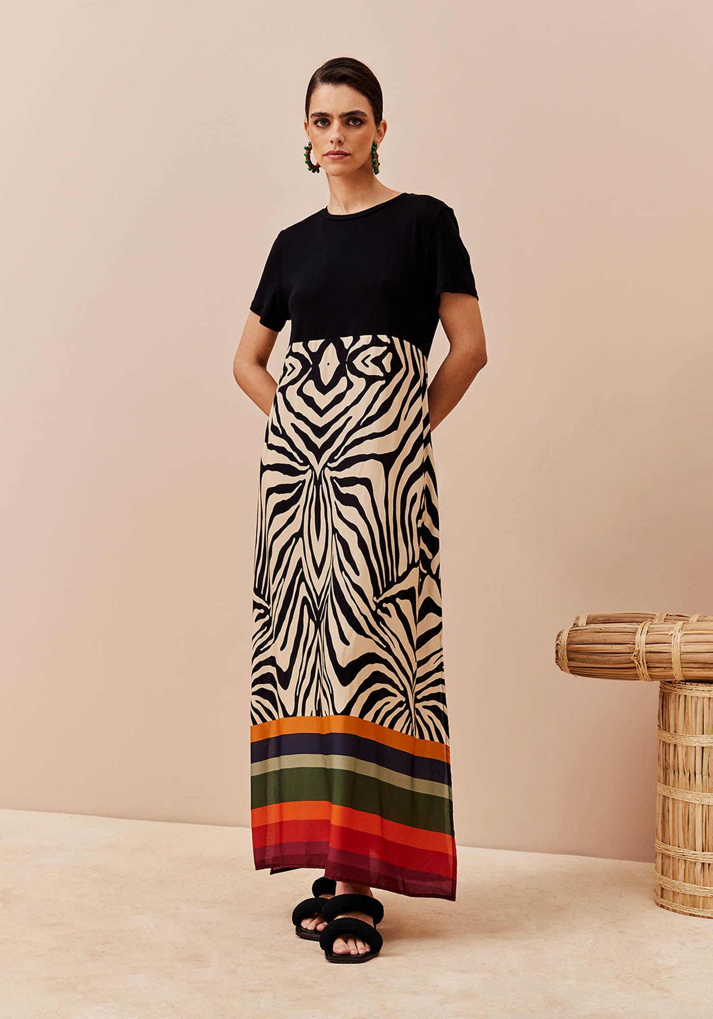 Ovestido estampado com mix de tecidos é um clássico das coleções. O modelo éconfeccionado em malha e viscose e é super versátil e confortável. O shape éamplo e soltinho e a peça ainda possui duas fendas laterais que refletem no movimentoe mobilidade que o vestido proporciona.