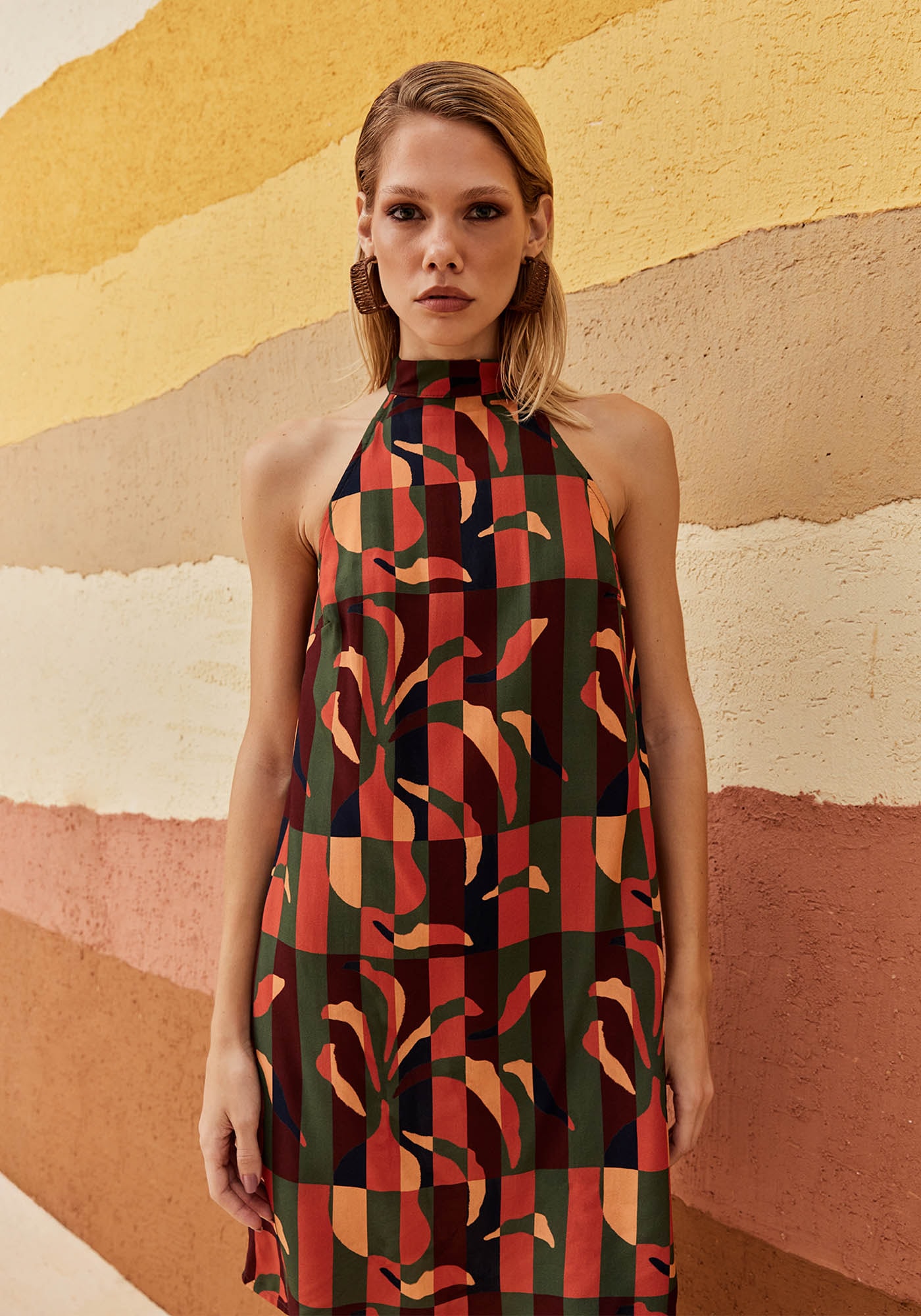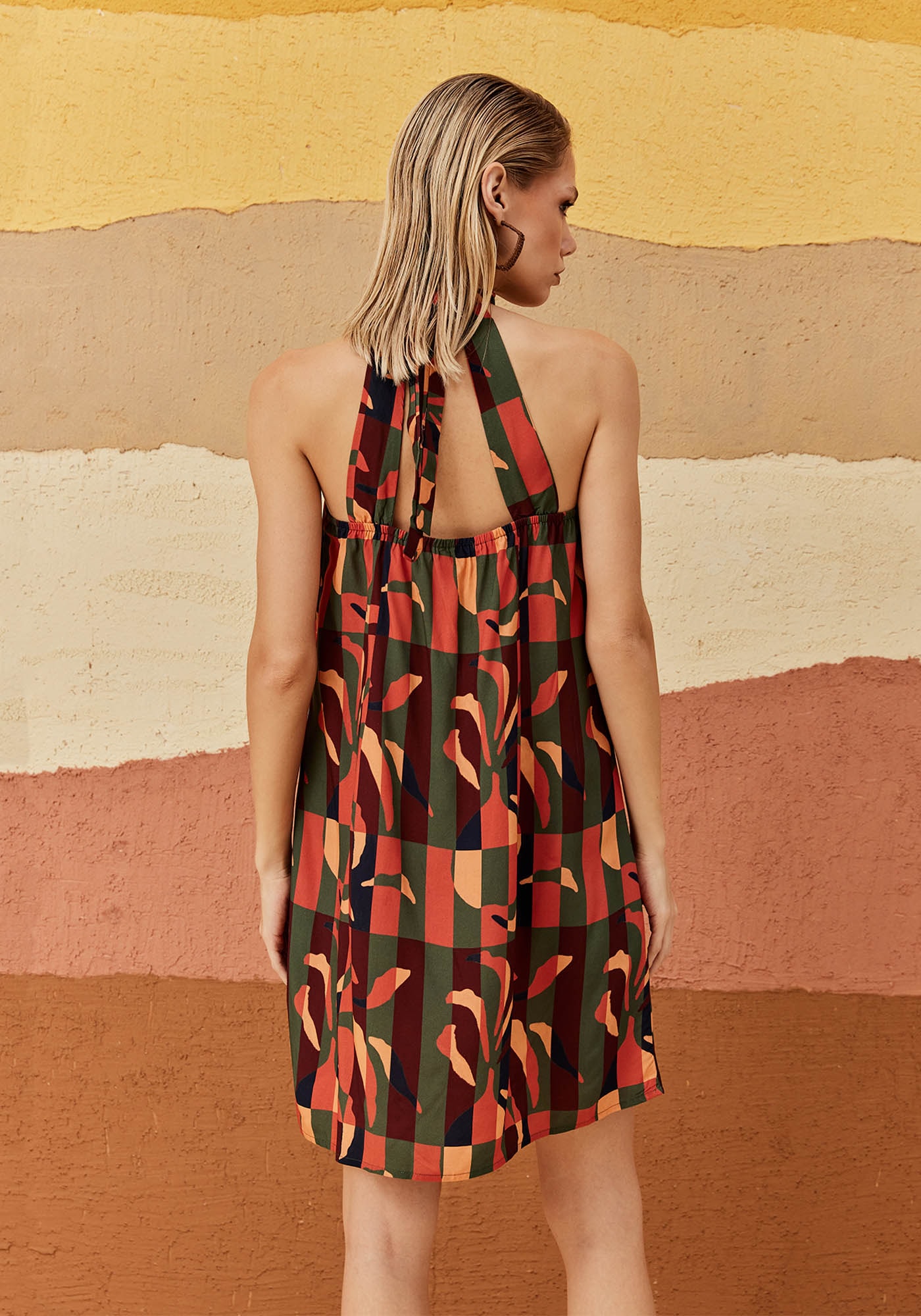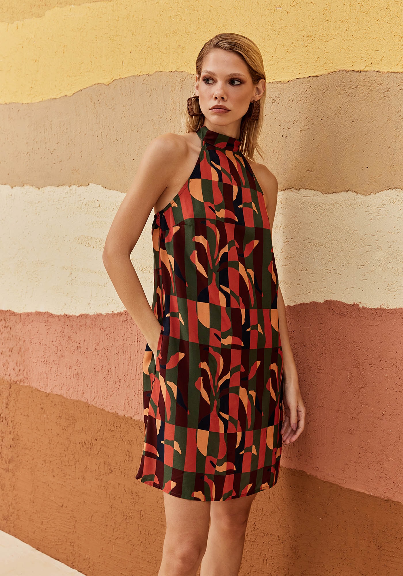 O vestidoestampado Ayasana é confeccionado em tecido 100% viscose. O modelo curto possui decote alto com golinha que amarra na parte de trás e bolsos laterais, sendo moderno e versátil.