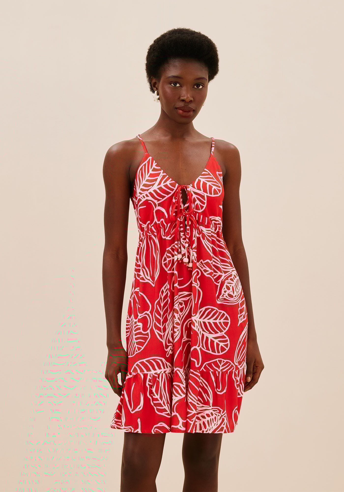 Leve, prático e delicado esteVestido Curto se destaca pela estampa Frutos da Terra. Apresenta decote frontalabertura e detalhe em amarração e túnel de ajuste abaixo do busto que além deadicionar um detalhe charmoso à peça proporciona um caimento personalizado nocorpo. Possui babado na barra que traz mais fluidez e movimento, bolsos nalateral que adicionam funcionalidade e alças finas ajustáveis. A composição éde 100% Viscose.