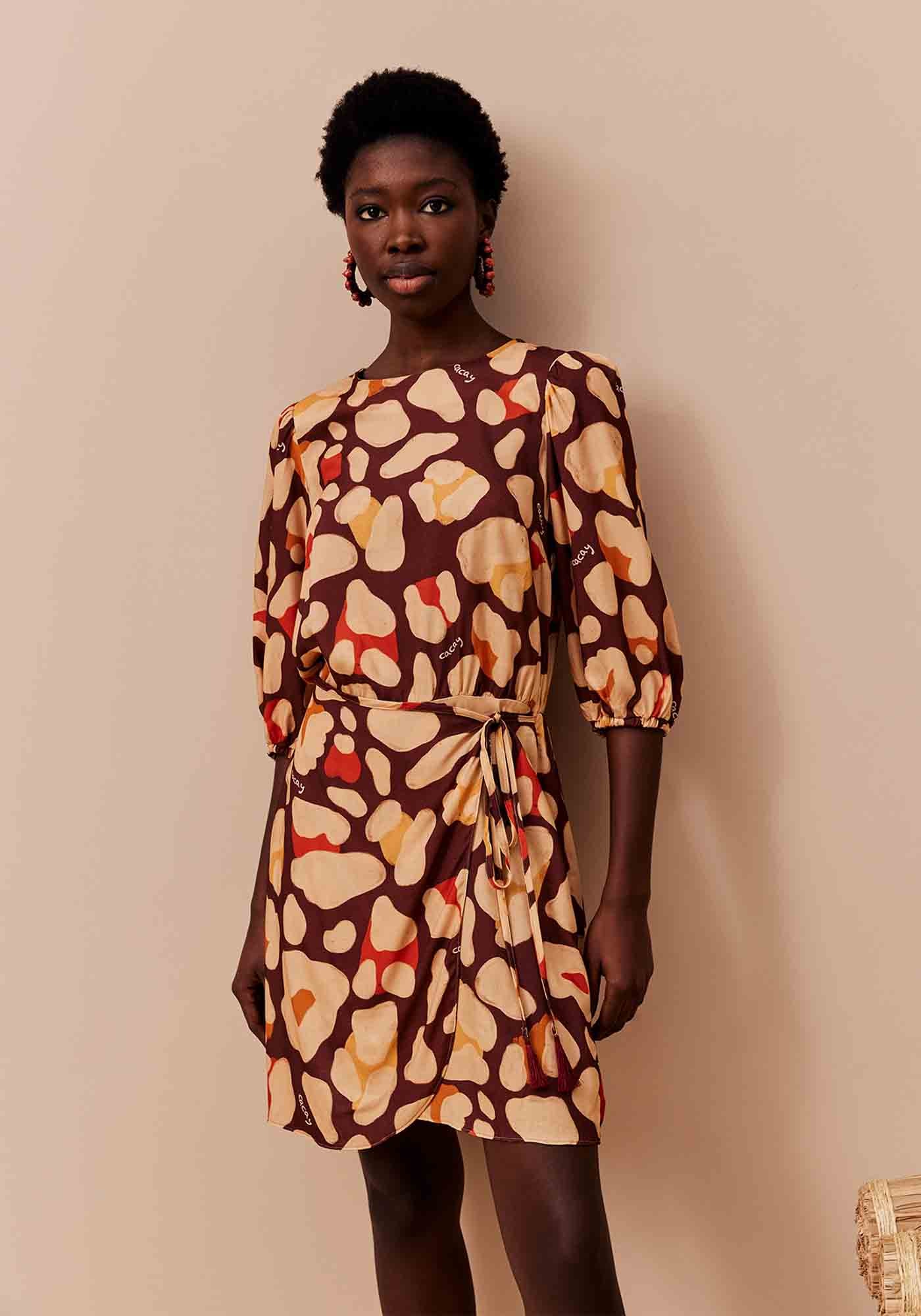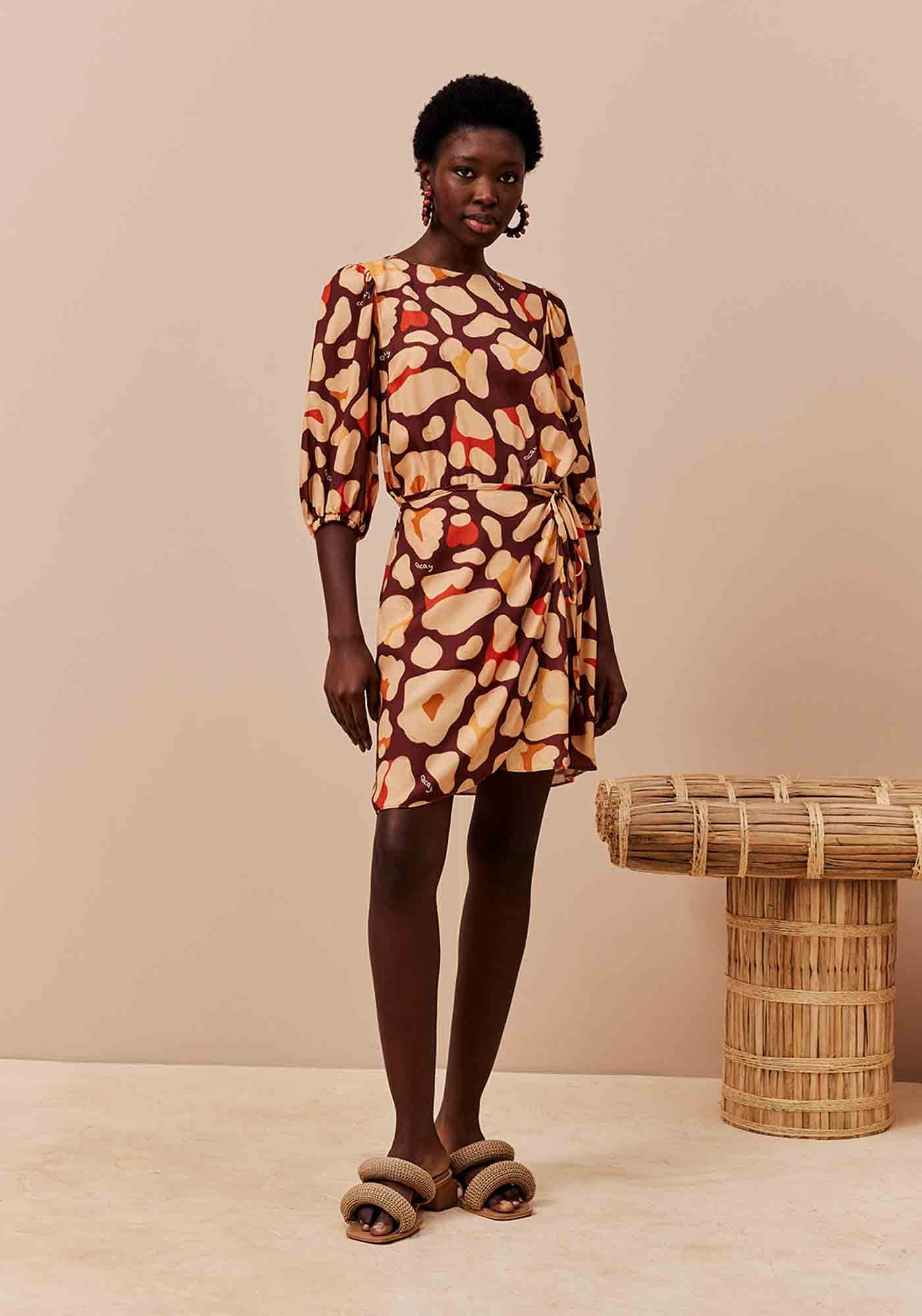 Confeccionadoem tecido 100% viscose, o vestido curto estampado Sami é elegante e gracioso. Modelocachecouer, possui uma saia transpassada na parte da frente com amarração nalateral. Além disso, contém manga ¾ bufante, elástico na cintura e abotoamentona parte de trás. A estampa Sami é um animal print moderno e estiloso.