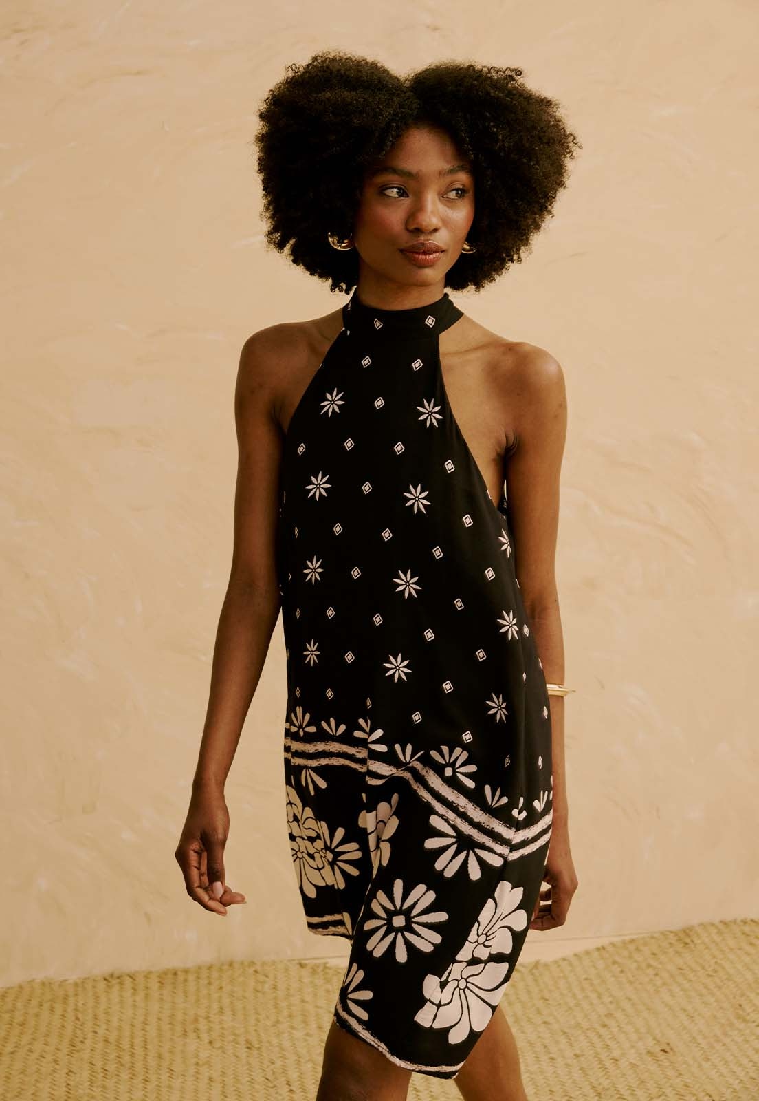 O Vestido Curto com Gola Alta Estampado Pallay da CaCay tem modelagem reta e elegante, com caimento solto no busto e cintura, proporcionando conforto sem marcar excessivamente. O quadril acompanha a linha do corpo de forma natural e o comprimento valoriza a silhueta com leveza. A forma é grande, então se estiver em dúvida entre dois tamanhos, recomendamos escolher o menor e consultar a tabela de medidas para precisão. A modelo da foto tem 1,75m, veste manequim 36 e está usando o tamanho P.