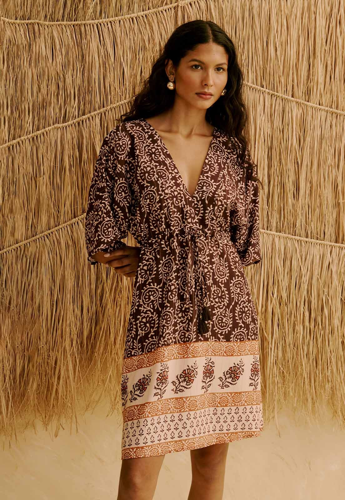 O Vestido Curto com Manga Ampla Estampado Kala da CaCay tem modelagem solta e elegante, com caimento confortável no busto e leve ajuste na cintura, garantindo fluidez até o quadril. O comprimento valoriza a silhueta de forma versátil, ideal para diferentes ocasiões. A forma é grande, então se estiver em dúvida entre dois tamanhos, recomendamos escolher o menor e consultar a tabela de medidas para precisão. A modelo da foto tem 1,75m, veste manequim 36 e está usando o tamanho P.