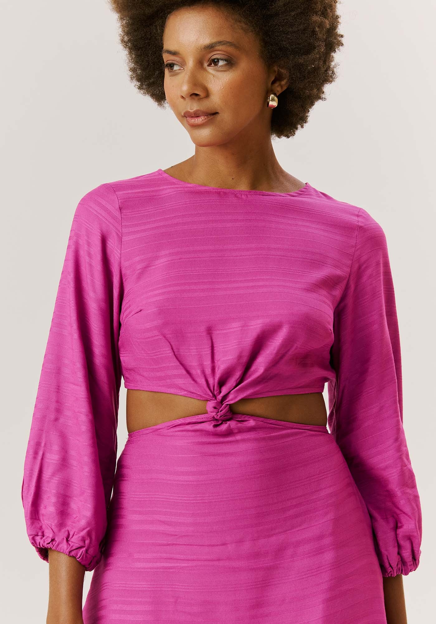 O vestido curto confeccionado emtecido 100% viscose é um modelo super charmoso. A peça com manga longa possuinó na parte da frente e babado na barra. O fechamento em botões na parte detrás delicado e bonito e dá um toque especial na peça.