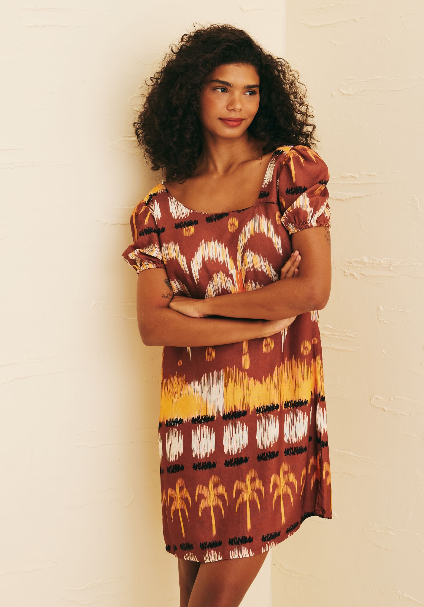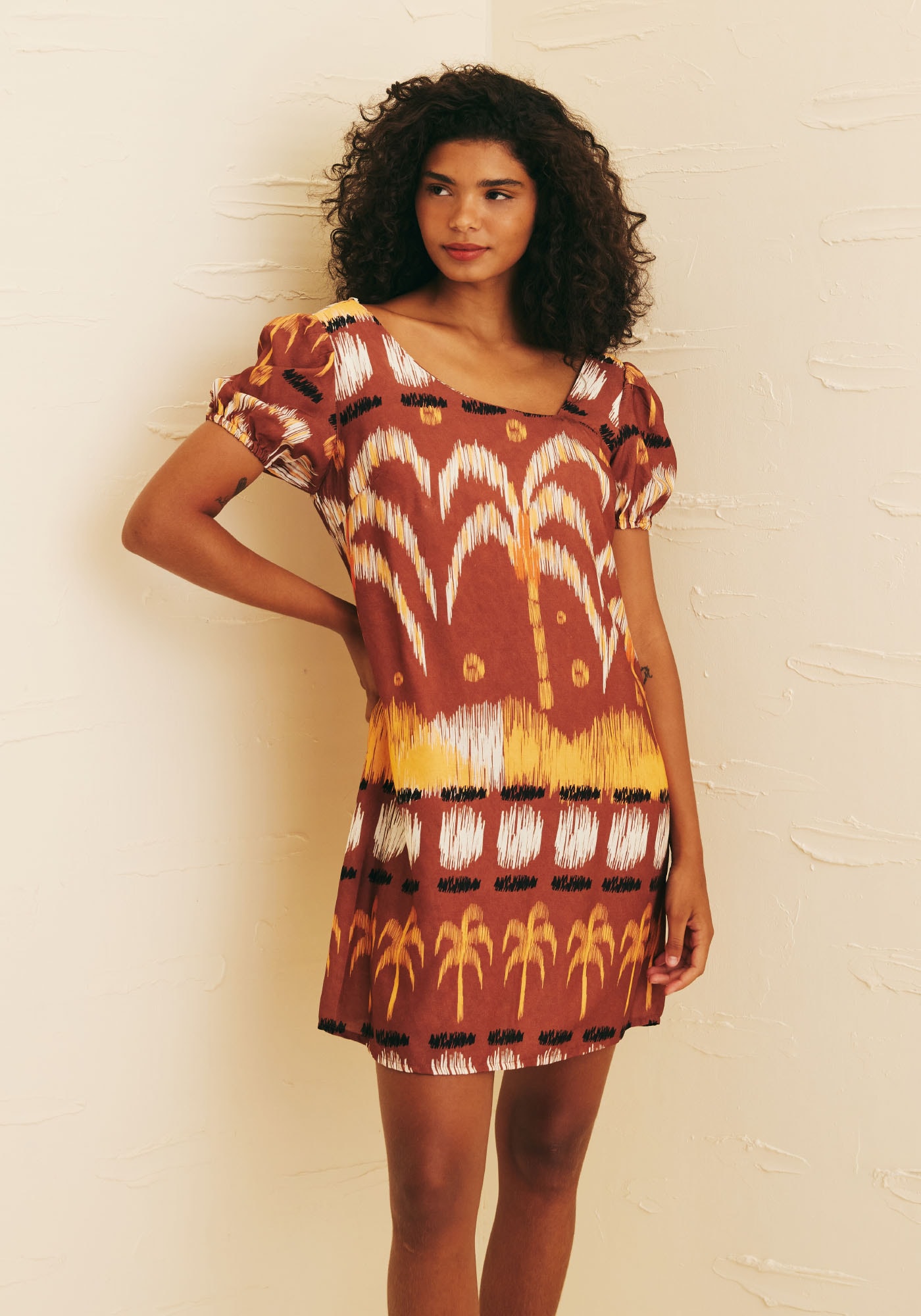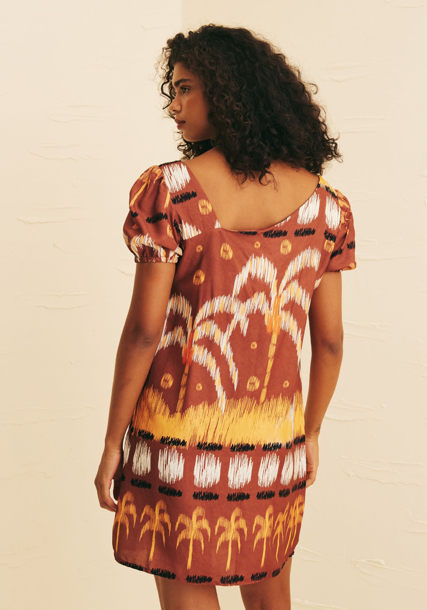 Encante-se com o Vestido CurtoDecote Assimétrico, confeccionado em 100% viscose em nossa estampa exclusivaHuacachina. Este modelo é perfeito para quem busca um look que combinemodernidade e romantismo. Seu decote assimétrico traz um ar contemporâneo àpeça, enquanto o caimento evasê juntamente à sua manga princesa trazem leveza,movimento e sofisticação.