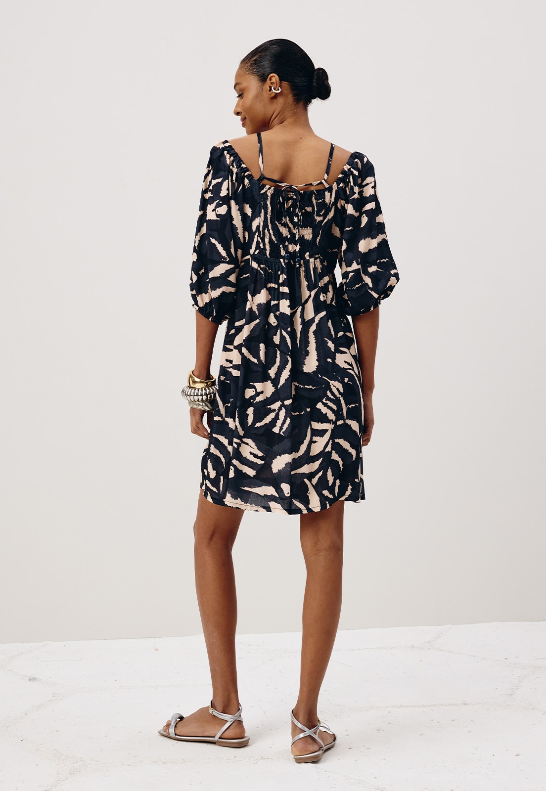 O vestido curto estampado Pararú é confeccionado em tecido 100% viscose.É um modelo charmoso, que possui manga bufante com decote cruzado na parte da frentee lastex nas costas.