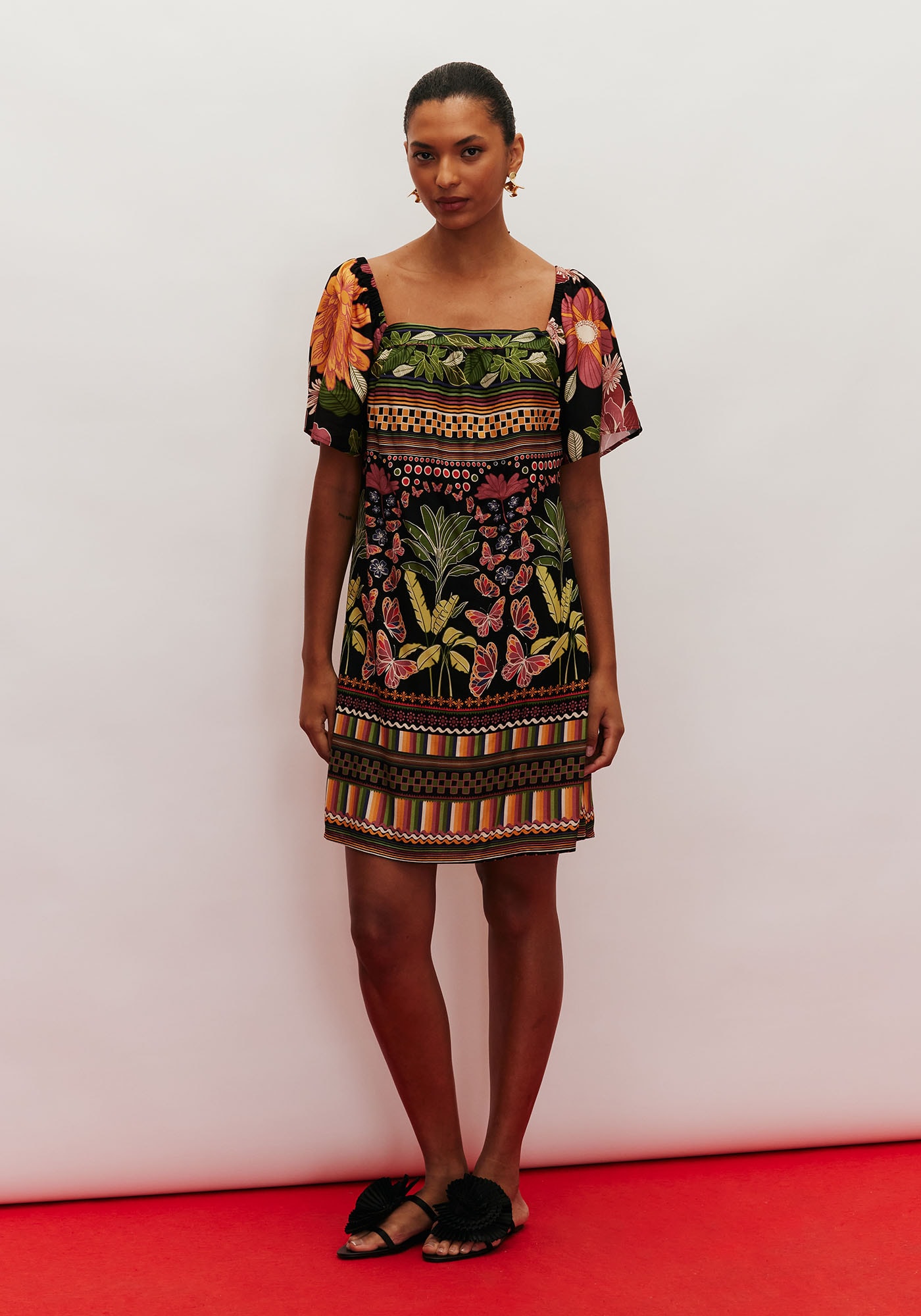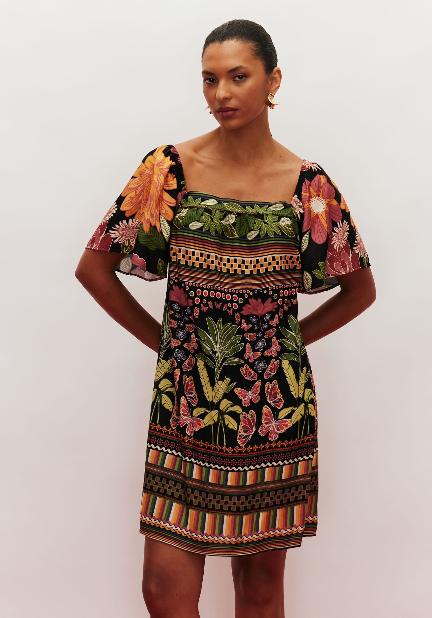 Modelo encantador, o vestido curto é confeccionado em tecido 100% viscose e possuidecote quadrado com manga curta solta. Possui amarração com ajuste nas costas elastex para melhor ajuste ao corpo.