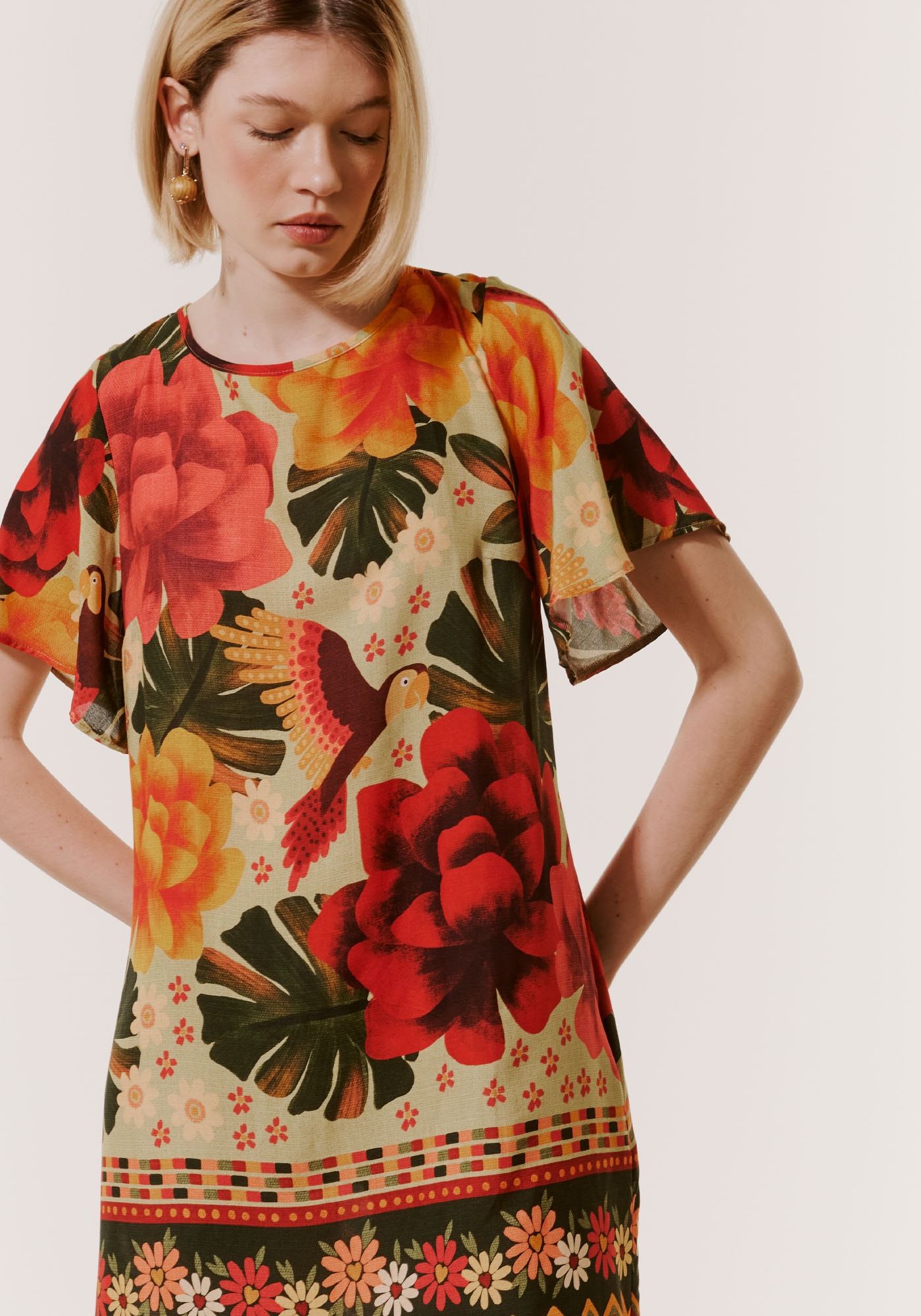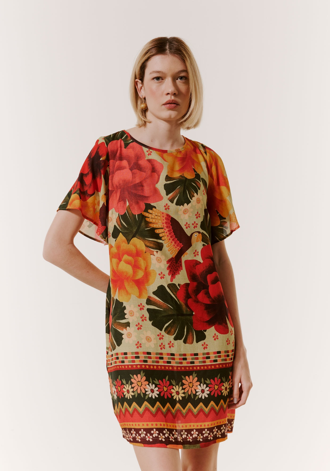 Confeccionado no elegante tecido deviscose, este encantador vestido apresenta uma linda estampa tropical. Amodelagem reta e as mangas amplas dão um toque especial de conforto esofisticação à peça.