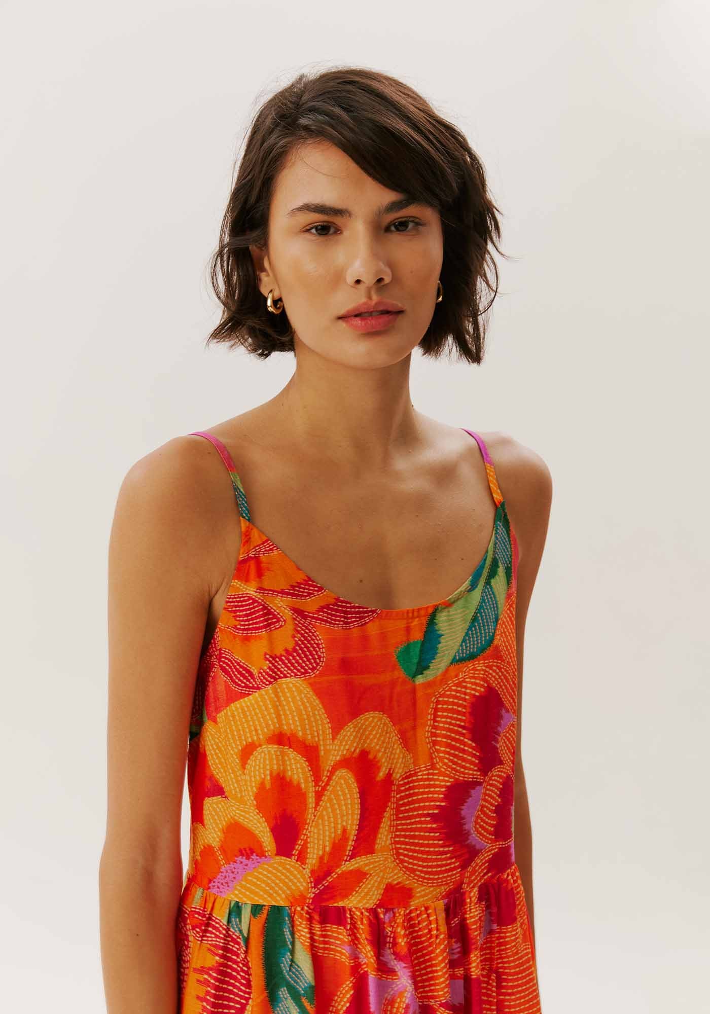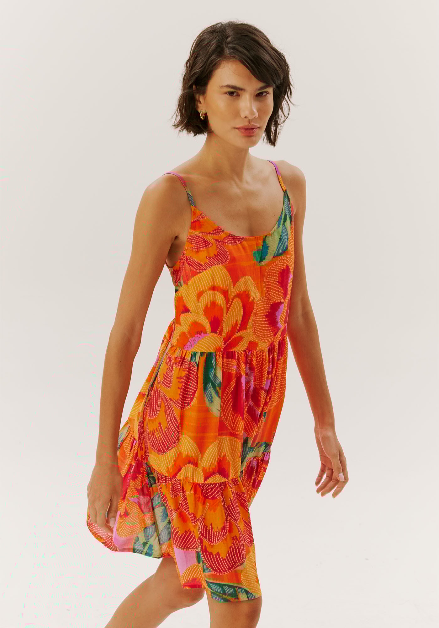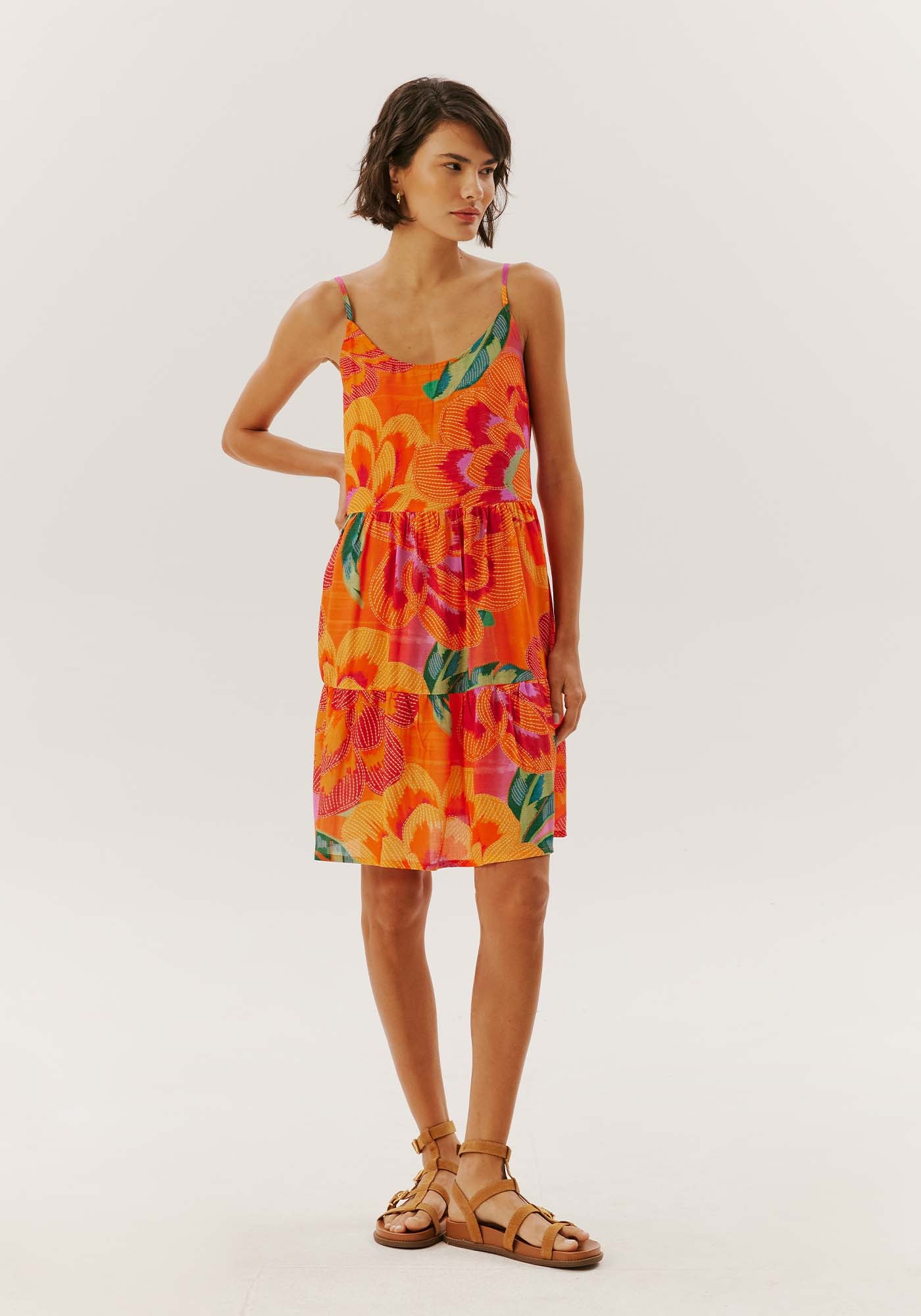 Vestido curto é sempre uma excelente opção nos dias maisquentes. A estampa Aruba traz um floral em sua composição e conta com cores quentese vibrantes.