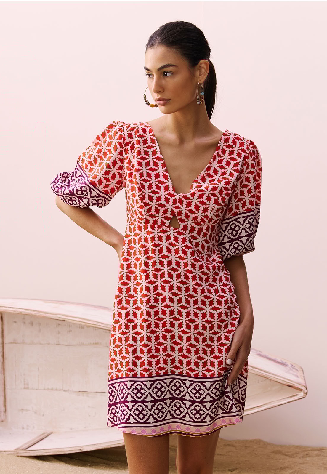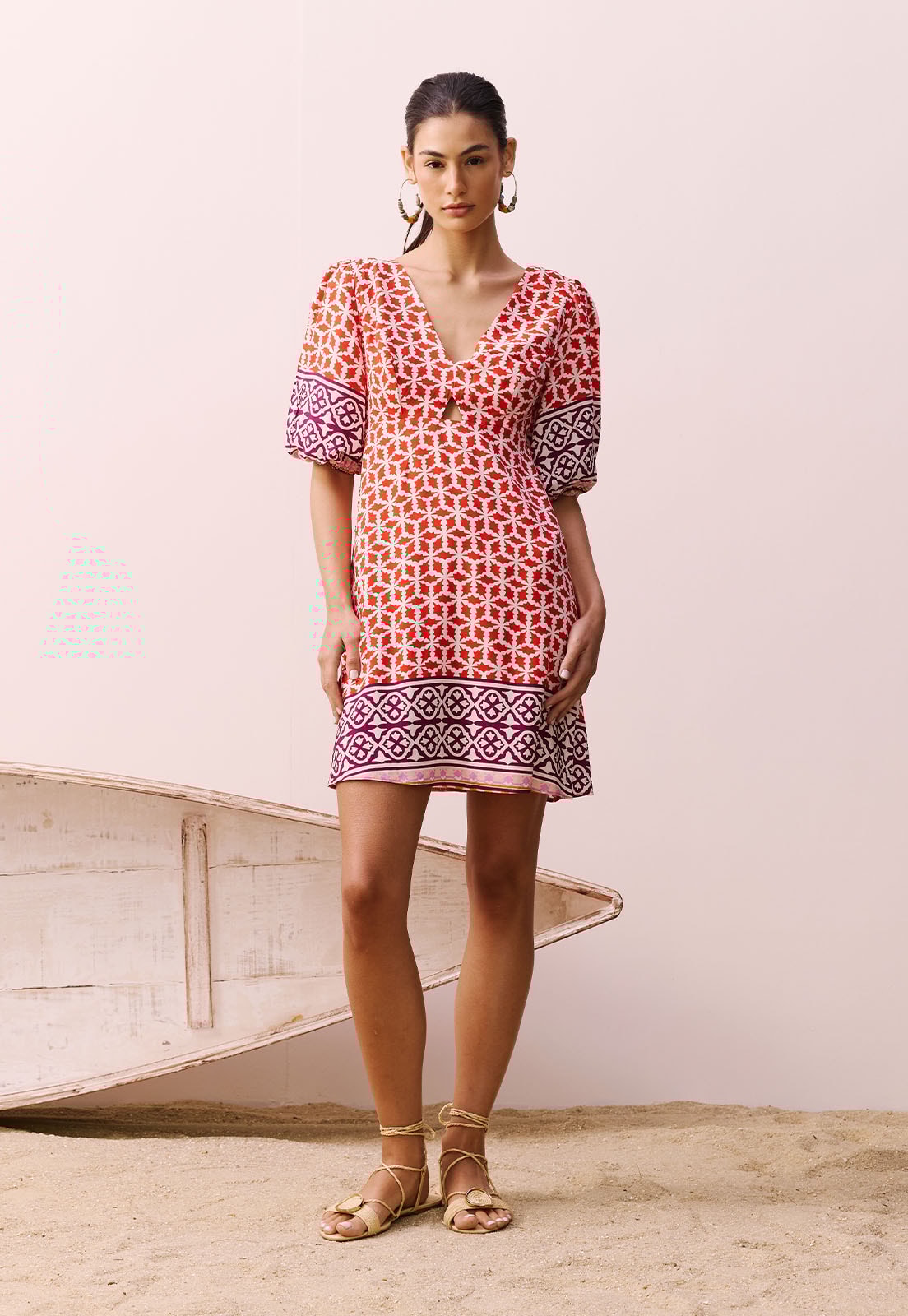 O Vestido Curto Estampado Belterra da CaCay é a escolha perfeita para quem busca leveza, estilo e conforto em uma única peça. Confeccionado em 100% viscose, seu tecido fluido garante um caimento solto e elegante, ideal para dias quentes e momentos descontraídos. O design geométrico com detalhes contrastantes valoriza a silhueta sem marcar, enquanto o decote em V e a amarração nas costas adicionam um toque de charme atemporal. As mangas curtas e levemente bufantes, finalizadas com faixas estampadas, criam um equilíbrio visual sofisticado.