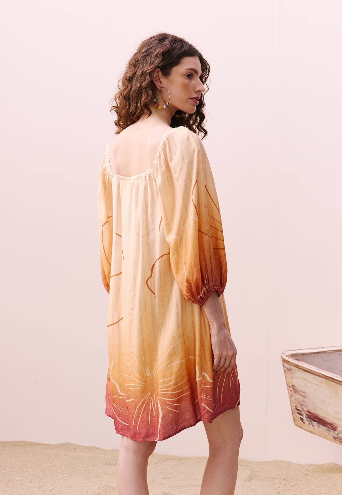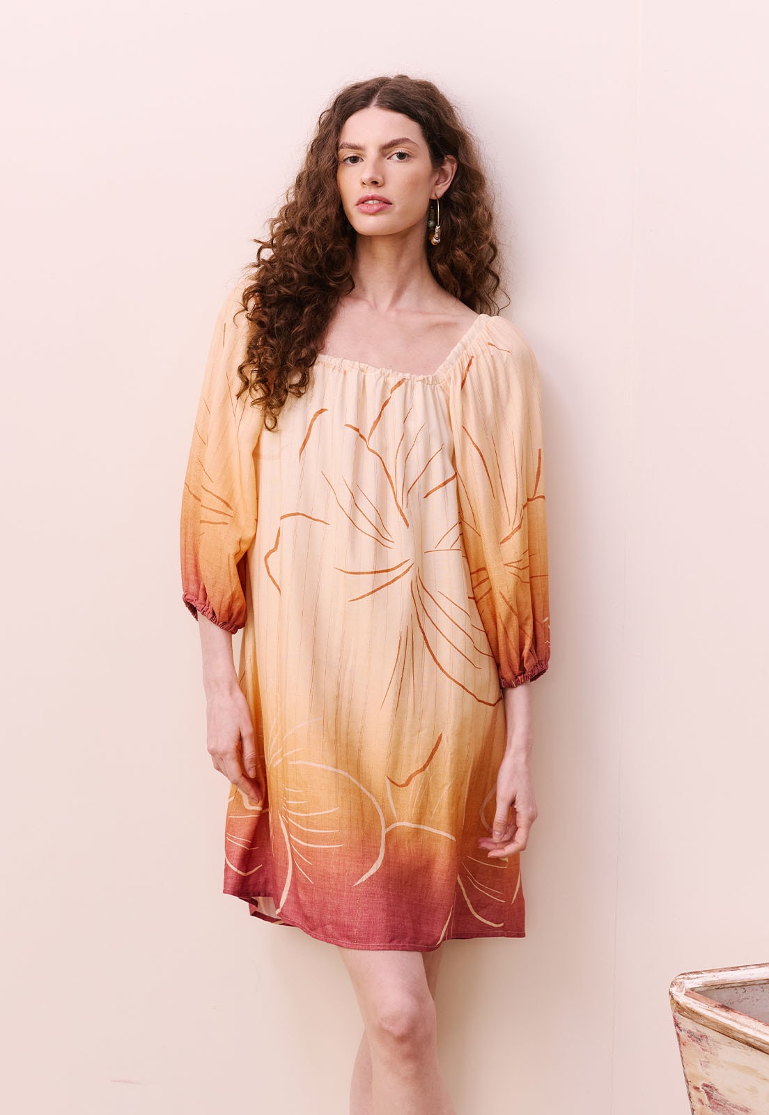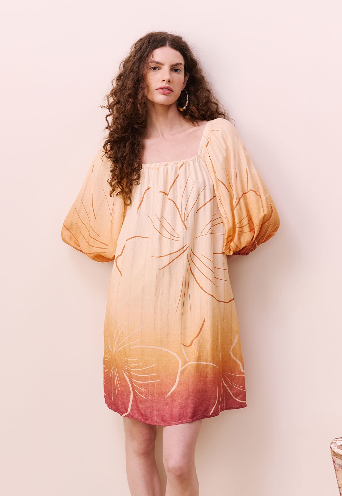 Descubra o charme vibrante do Vestido Curto Estampado Pérola do Tapajós, uma peça que traduz a essência da nova coleção da CaCay com elegância e frescor. Com silhueta fluida e mangas bufantes que adicionam um toque romântico, este vestido é ideal para quem busca leveza sem abrir mão da sofisticação. O decote em V valoriza o colo, enquanto o caimento soltinho proporciona conforto absoluto nos dias mais quentes. A estampa exclusiva, inspirada nas nuances do pôr do sol amazônico, é realçada por um degradê artístico e detalhes florais que evocam a beleza natural do Tapajós.