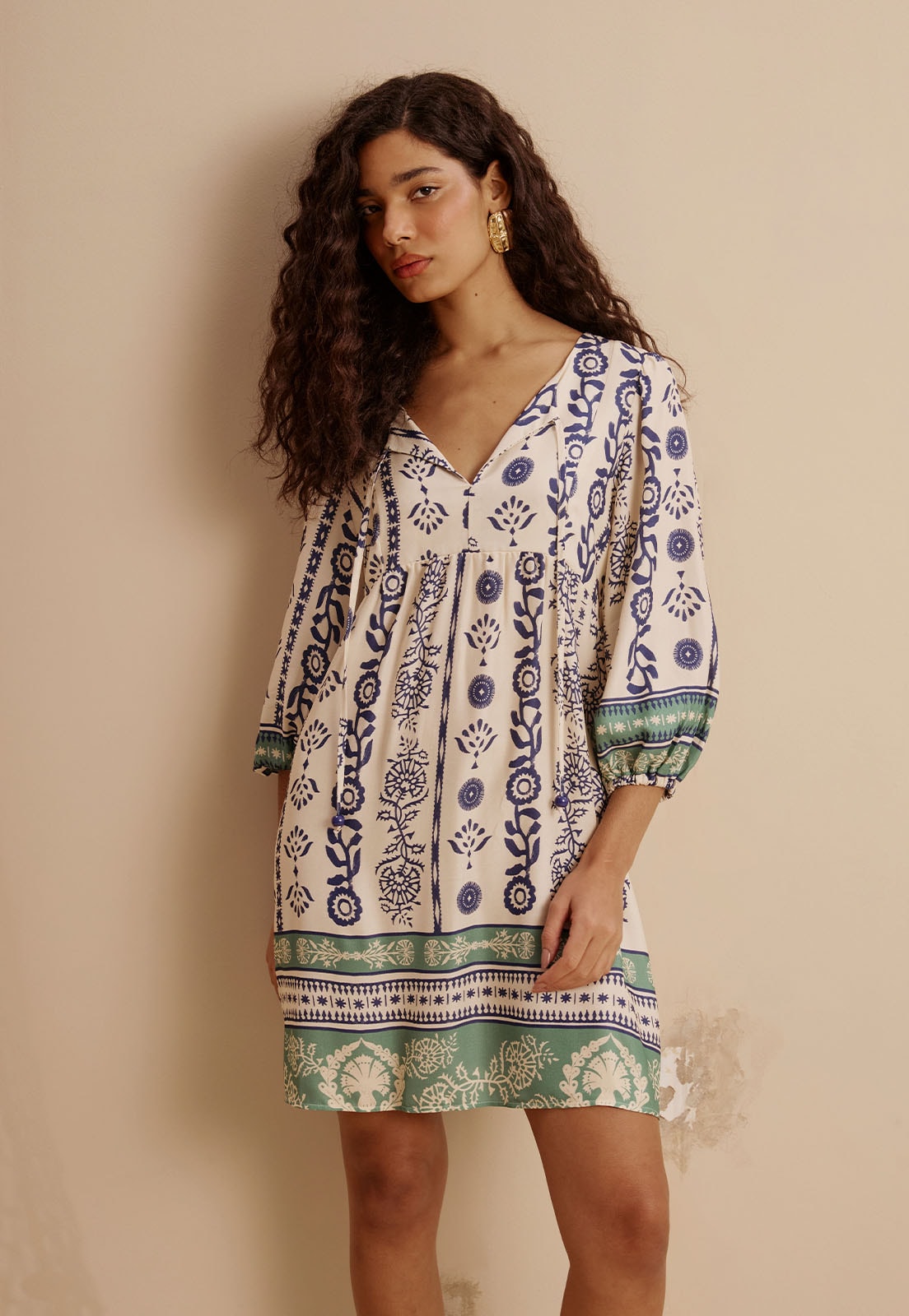 O Vestido Curto Estampado Vinca da CaCay é a escolha perfeita para quem busca leveza e sofisticação em uma única peça. Confeccionado em 100% viscose, oferece toque suave e caimento fluido, valorizando diferentes silhuetas com conforto e elegância. Seu design traz decote em V, mangas três quartos com punhos elásticos e uma costura abaixo do busto que cria um delicado franzido, realçando o movimento da saia. A estampa combina elementos geométricos e florais em composição vertical, com uma faixa contrastante na barra que adiciona charme e personalidade ao visual.