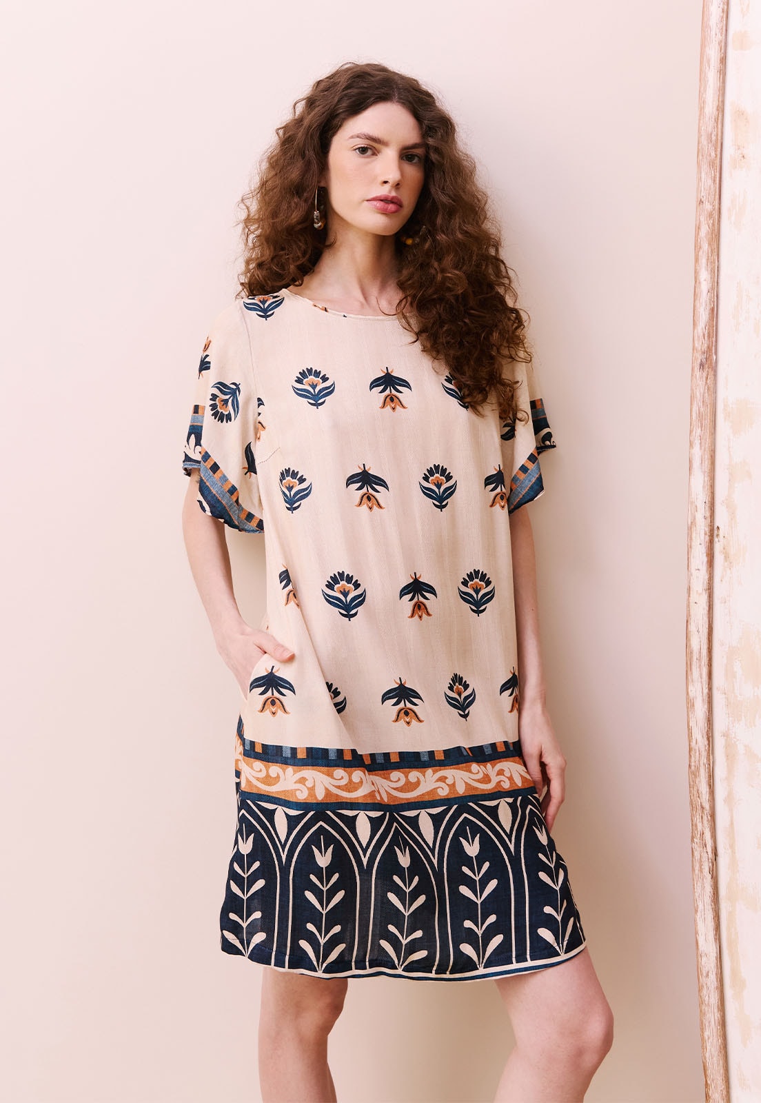 O Vestido Curto Estampado Vitrais da CaCay é a escolha perfeita para quem busca leveza, sofisticação e um toque artístico no dia a dia. Com design inspirado em vitrais e detalhes florais estilizados, essa peça une formas geométricas e elementos orgânicos em uma composição visualmente marcante. O modelo tem caimento solto e confortável, com mangas amplas e decote redondo com amarração nas costas, valorizando o movimento e a fluidez do tecido composto por 97% viscose e 3% linho, ideal para climas amenos e dias ensolarados.