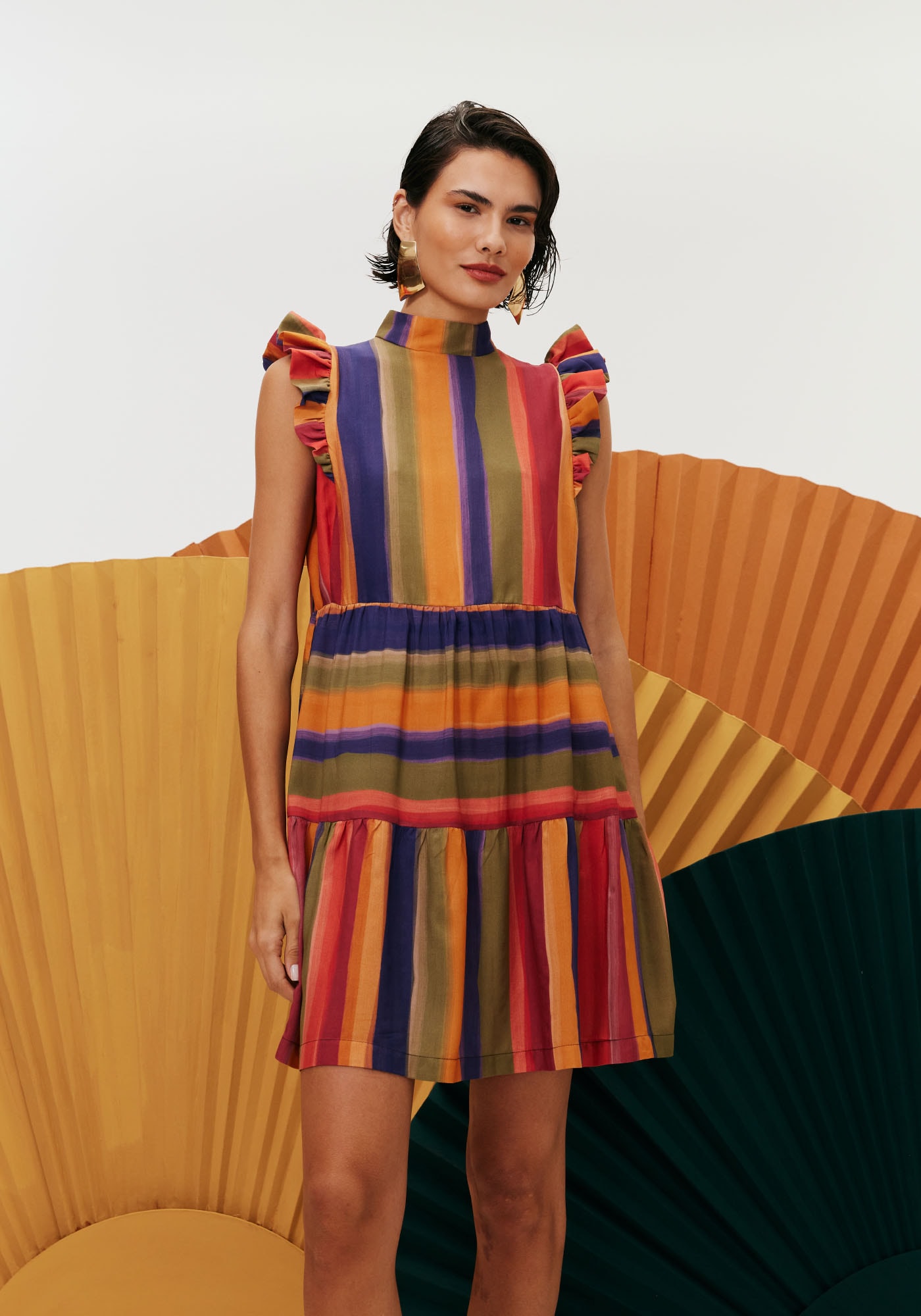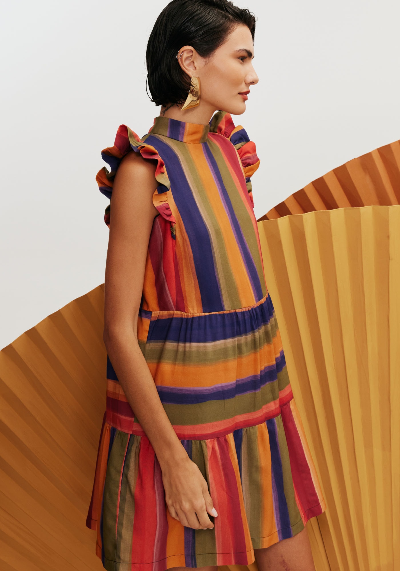 O vestido curto é um modelo belo eapaixonante. Confeccionado em tecido 100% viscose, possui golinha alta comabotoamento na parte de trás e manga com babadinho. O jogo das estampas navertical e horizontal é o que dá o charme para a peça. A maria dá movimento evolume ao vestido.