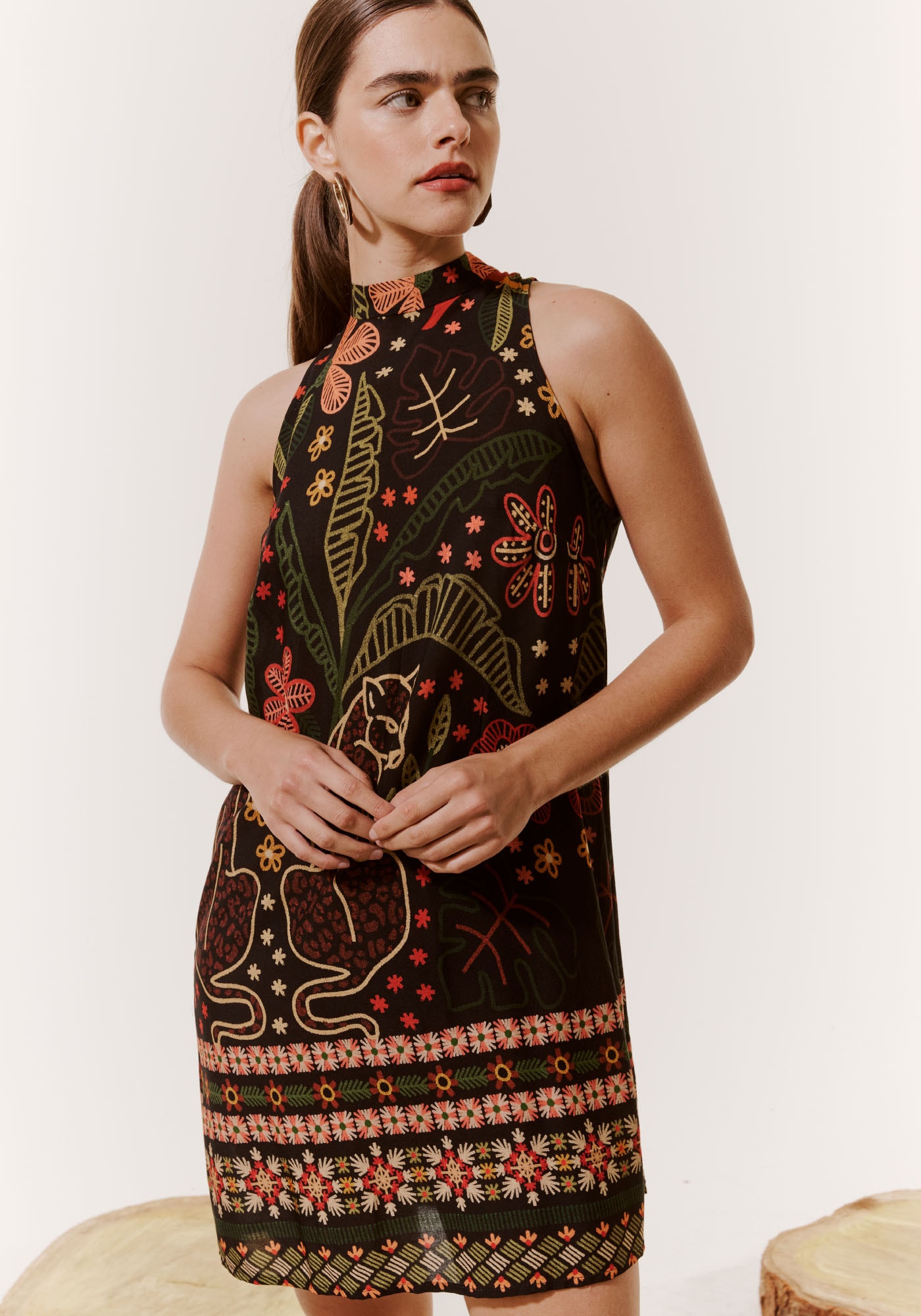 O vestido curto com golinha éestiloso e charmoso. Confeccionado com modelagem mais ampla e curta, a peça nãopossui manga e contém decote fechado finalizado com golinha. A estampa Bioma não passadespercebida e é uma referência à riqueza da fauna e flora, onde as coresganham mais destaque com o fundo preto.