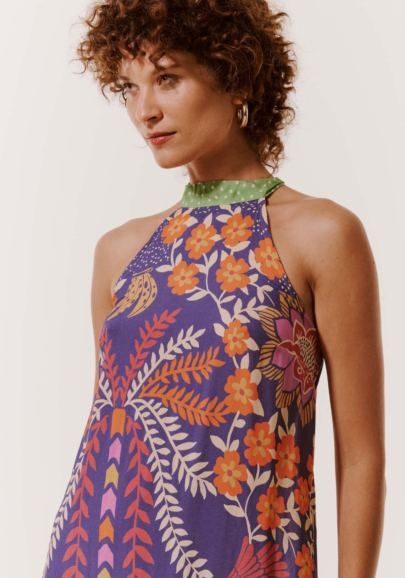 O vestido curto com golinha éum modelo charmoso e sofisticado. A estampa Copaíba é vibrante e alegre epossui uma mistura de elementos como o poá, a fauna e a flora.