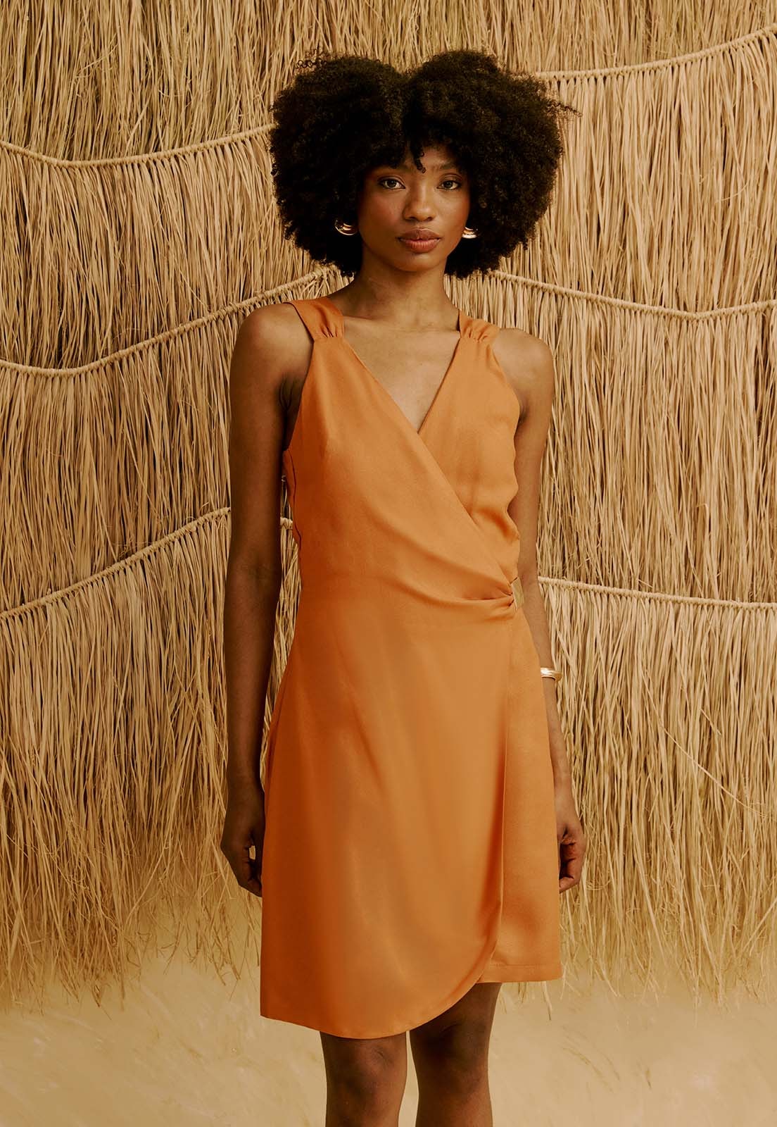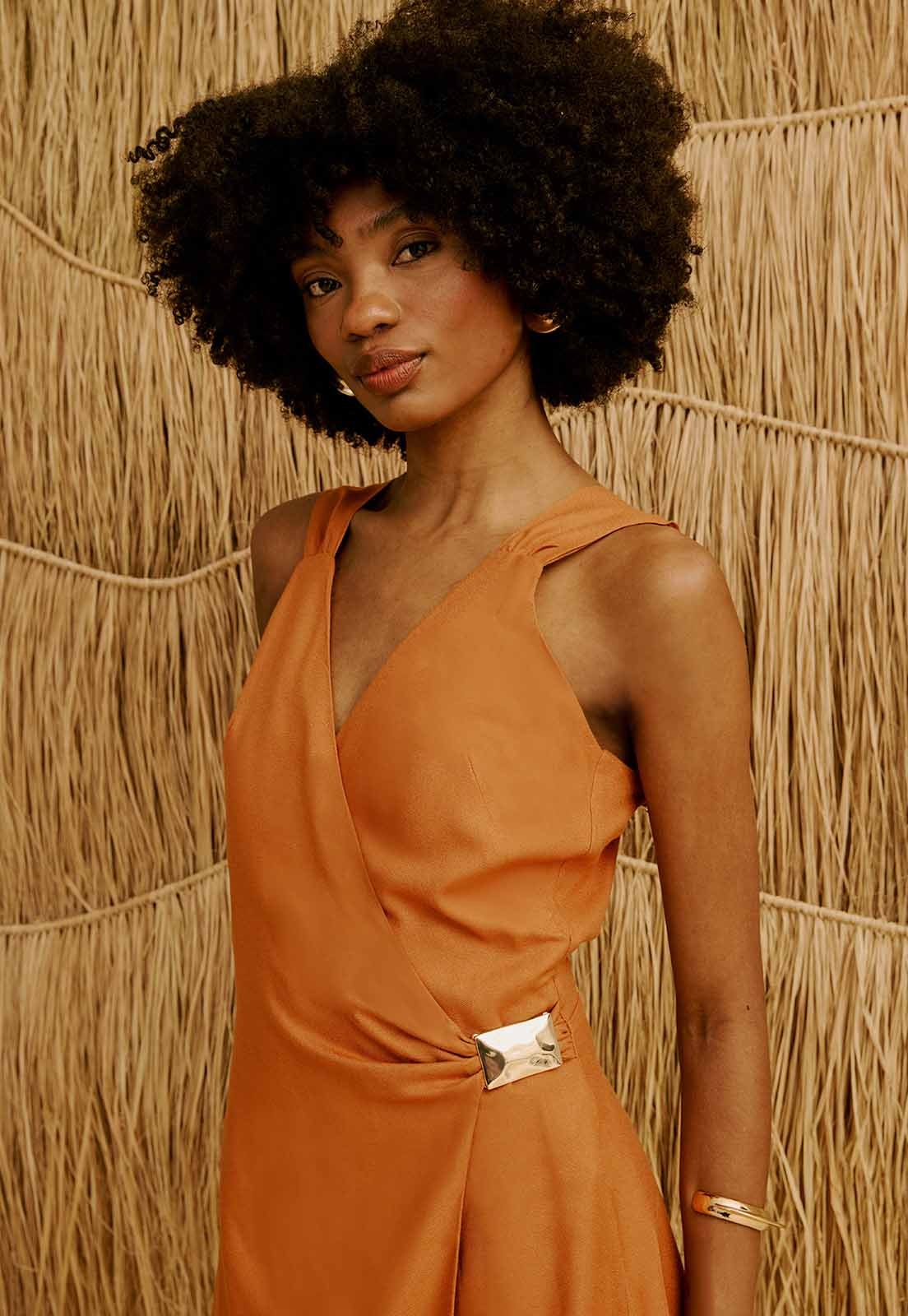 O Vestido Curto Liso com Fivela Metal da CaCay tem modelagem elegante, com decote em V e cintura marcada por detalhe metálico que valoriza a silhueta. O caimento é fluido no quadril, com comprimento que acompanha o movimento do corpo. A forma é grande, então se você estiver em dúvida entre dois tamanhos, recomendamos optar pelo menor. Consulte a tabela de medidas para mais precisão. A modelo da foto tem 1,75 m, veste manequim 36 e usou o tamanho P.