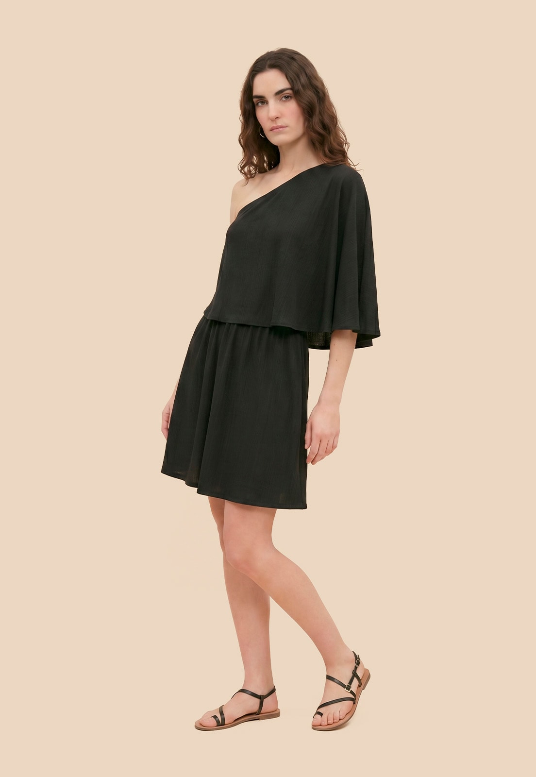 Confeccionado em poliéster com elastano, o tecido tem toque macio e boa elasticidade, permitindo uso com liberdade de movimento. É uma peça leve e versátil, perfeita para ocasiões casuais, encontros ou eventos informais. O design de um ombro só traz sofisticação atemporal, e combina bem com acessórios dourados, sandálias de tiras ou clutch estruturada.