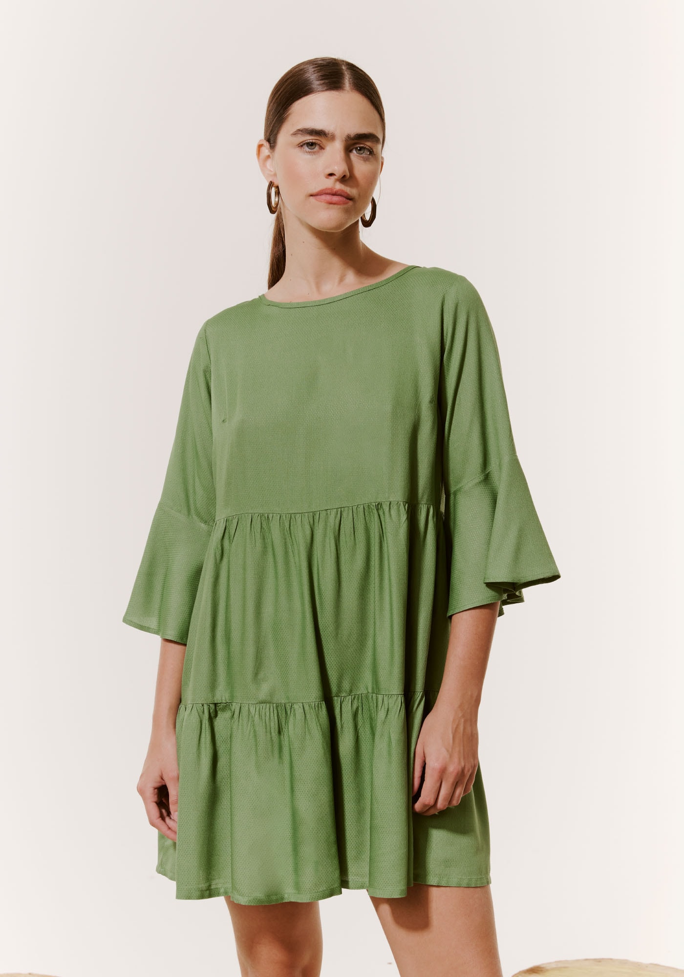 Esse modelo é romântico e sofisticado. Confeccionado em tecido 100% viscose, o comprimento curto e maisousado possui como complemento a modelagem mais solta e as mangas ¾ com a bocamais larga. As marias deixam o vestido com mais movimento e fluidez.