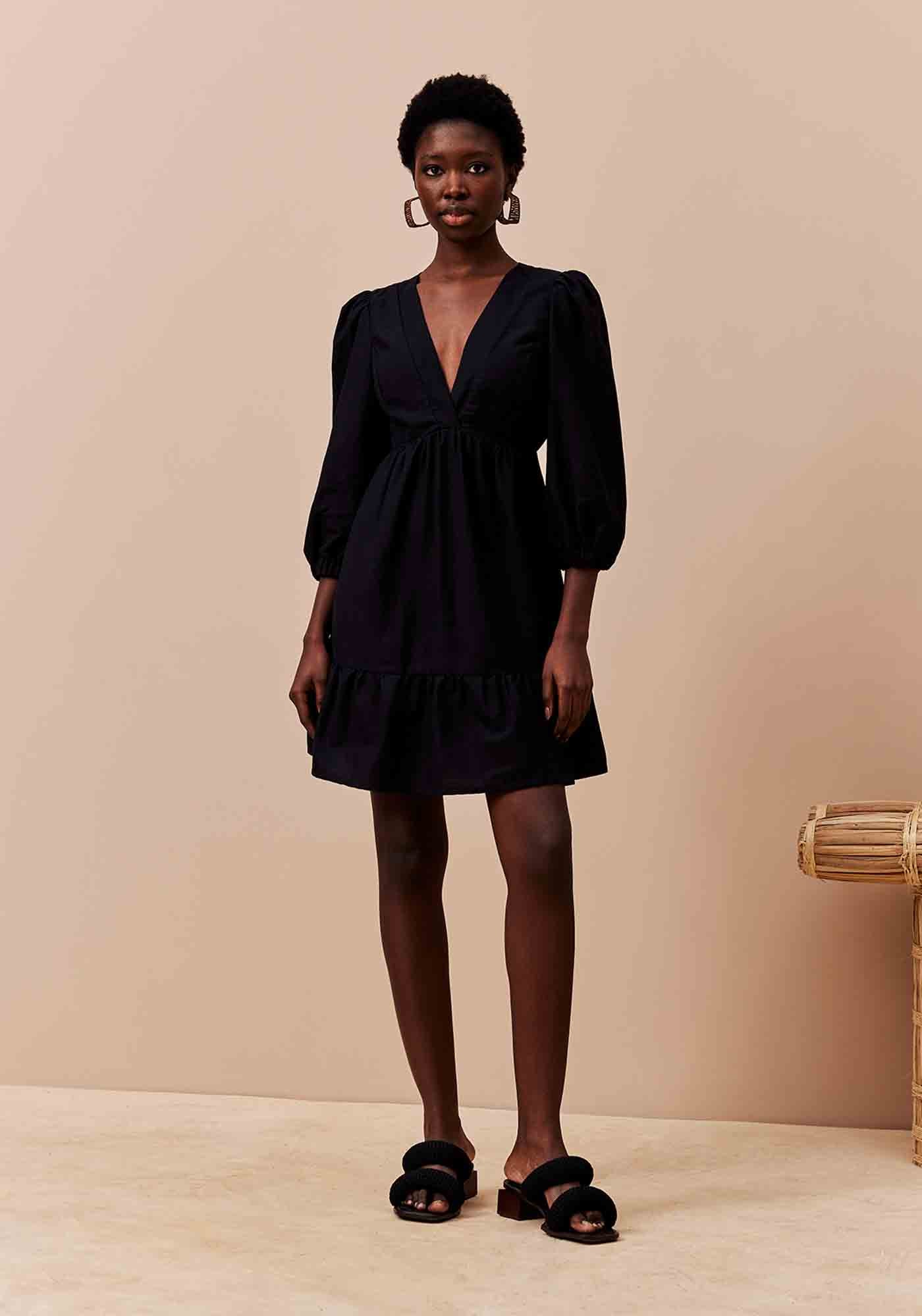Este vestido curto exala elegância com seu decote profundo com pala em V. As mangas bufantes 7/8 trazem um toque de volume quecontrasta com a saia ampla e fluída, que termina em uma charmosa maria nabarra. O elástico nos punhos e na cintura garante um ajuste confortável efeminino, enquanto a abertura nas costas com fechamento em botão adiciona umdetalhe sofisticado. Feito com 70% de algodão e 30% de viscose, o tecido é levee agradável, sem perder a sofisticação.