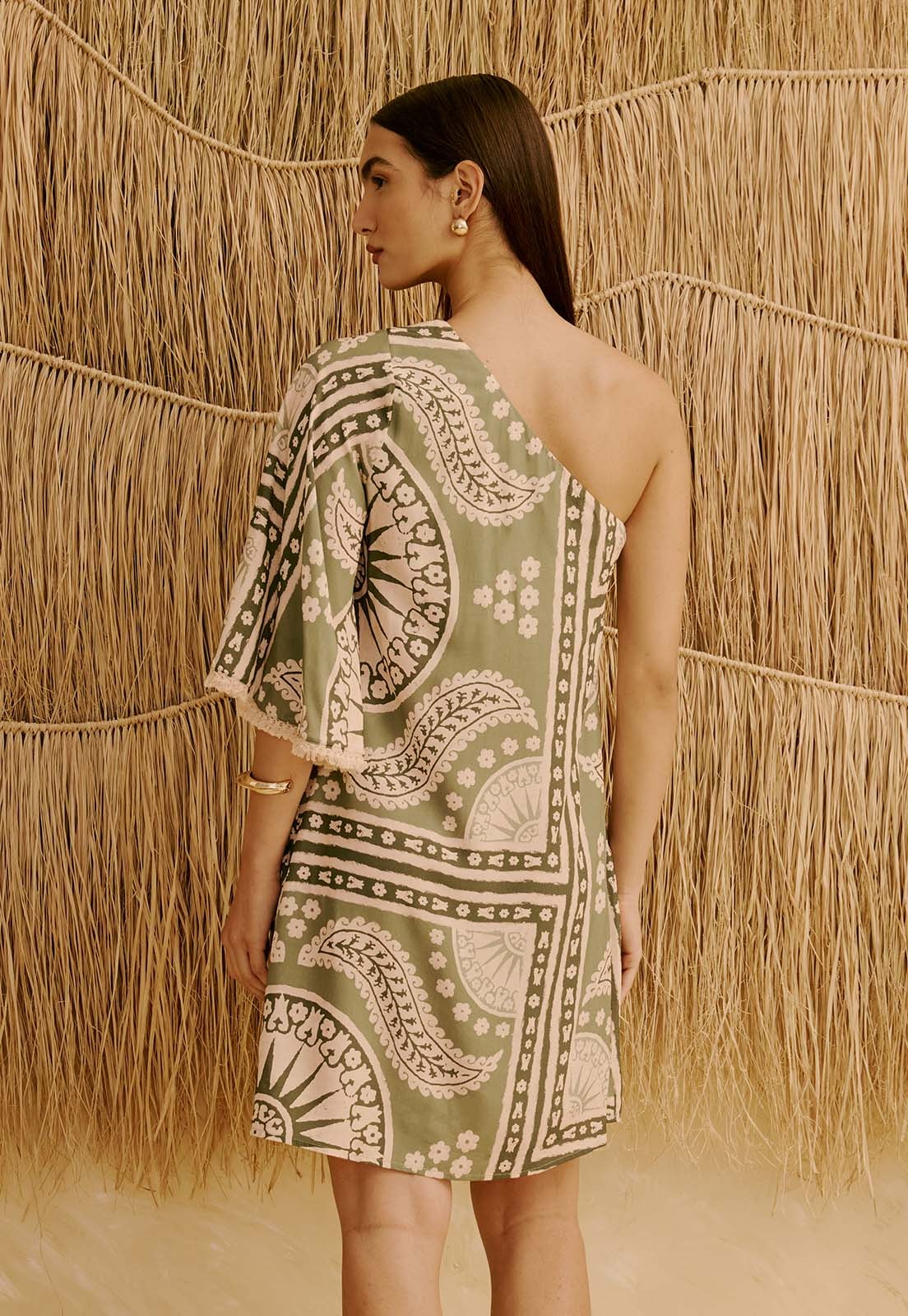 O Vestido Curto Manga com Franja Estampado Incaica da CaCay tem modelagem ampla e fluida, com caimento solto no busto e quadril, proporcionando conforto e liberdade de movimento. O comprimento é equilibrado para uso versátil e a manga única com franja adiciona um toque de estilo artesanal. A forma é grande. Se estiver em dúvida entre dois tamanhos, recomenda-se optar pelo menor, com base na tabela de medidas disponível. A modelo tem 1,75 m de altura, veste manequim 36 e está usando o tamanho P na foto.
