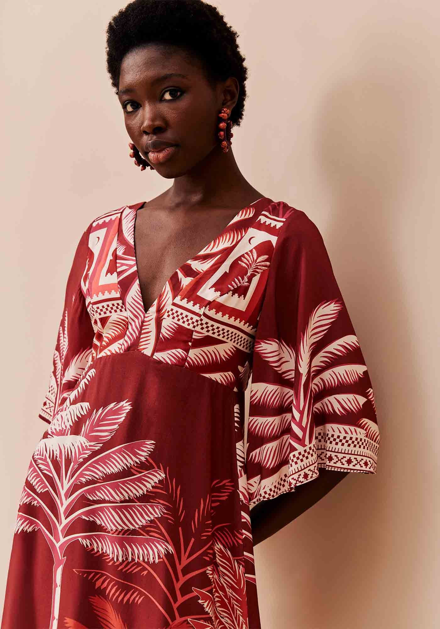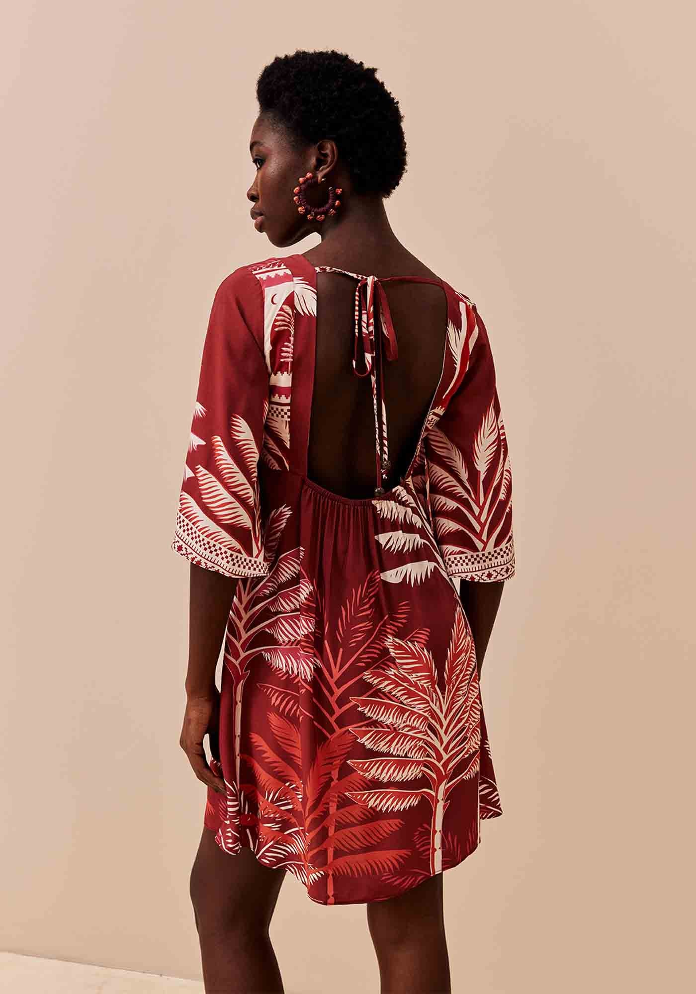 Confeccionadoem tecido 100% viscose, o vestido curto estampado Zapata é encantador. Commodelagem soltinha e confortável, a peça possui manga kimono e decote em v, valorizandoo busto. Além disso, contém um decote belíssimo na parte de trás, que conta comamarração finalizada com ponteira.
