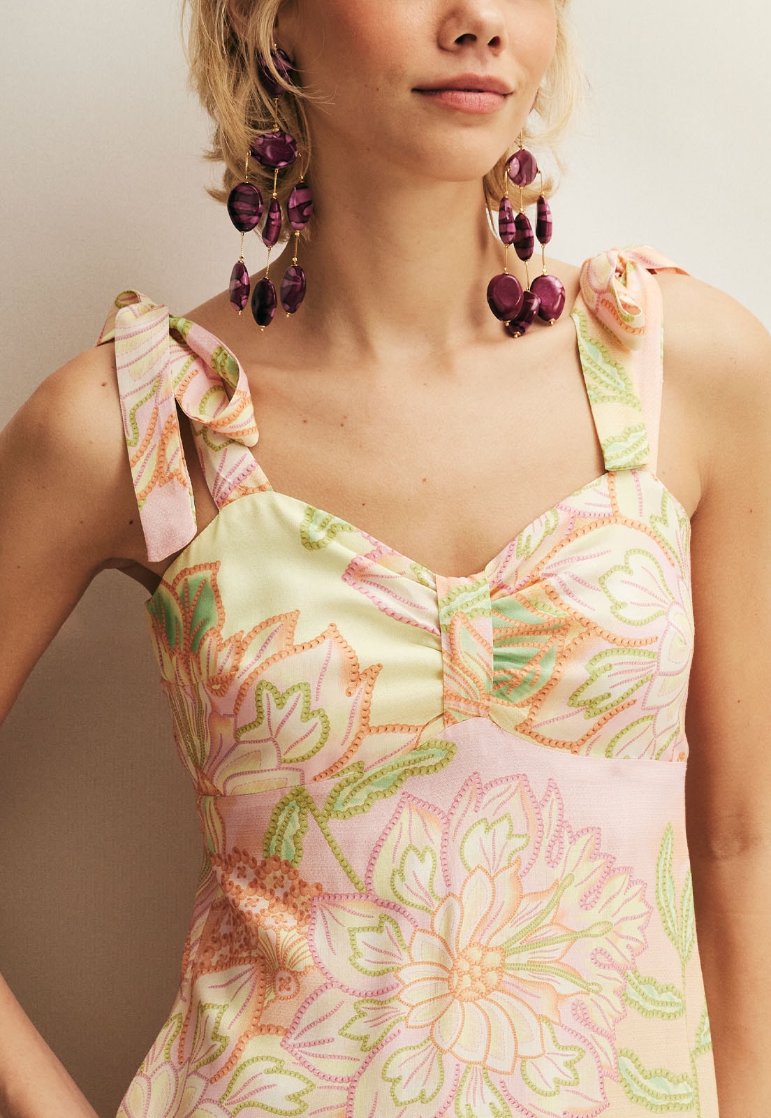 O Vestido Curto Maria da CaCay é a escolha perfeita para quem busca leveza e movimento com um toque de brasilidade. Confeccionado em 100% viscose, oferece caimento fluido e confortável, ideal para dias quentes ou ocasiões que pedem frescor e elegância. A estampa inspirada no estilo chita carimbó traz detalhes marcantes e um design que valoriza a silhueta, com alças ajustáveis e recorte delicado no busto para um ajuste impecável.