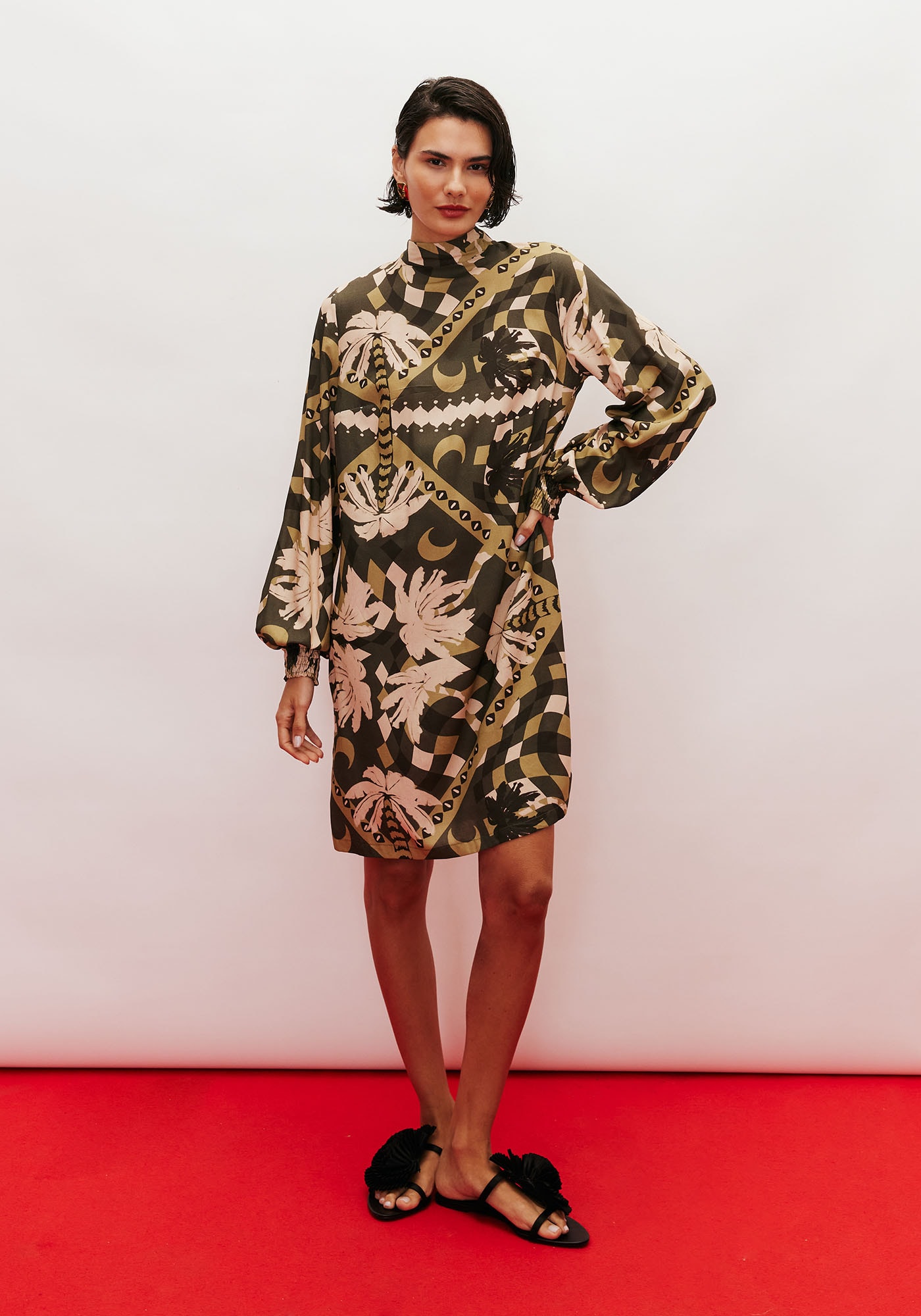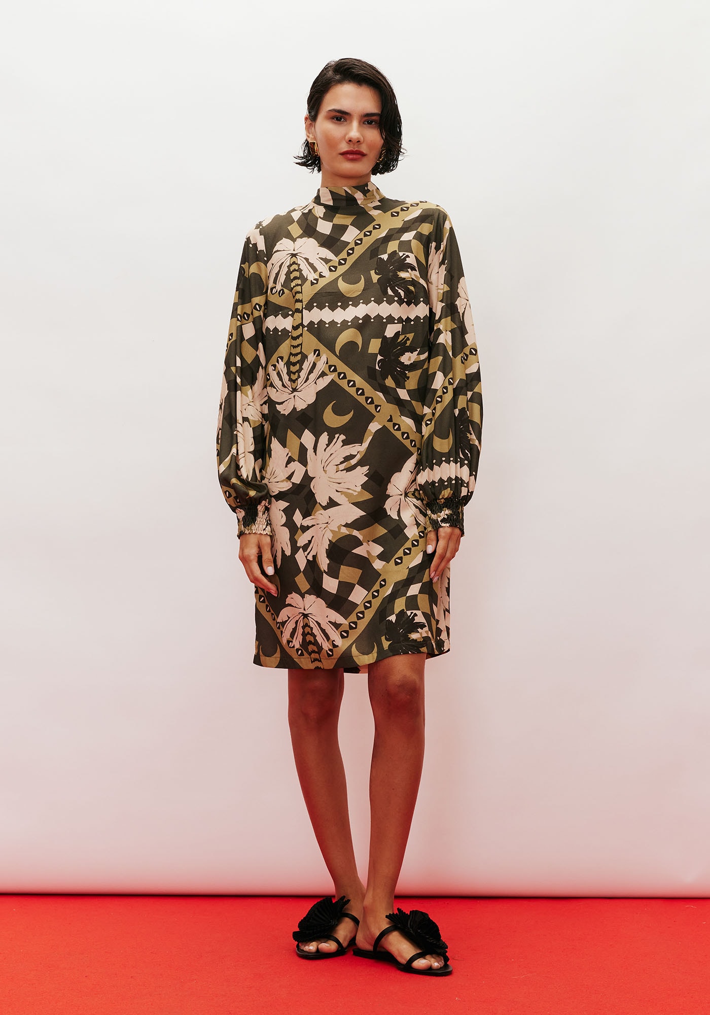 Confeccionado em tecido 100% viscose, o vestidocurto é um modelo sofisticado e elegante. Com modelagem reta, possui mangalonga com lastex e golinha que amarram na parte de trás.