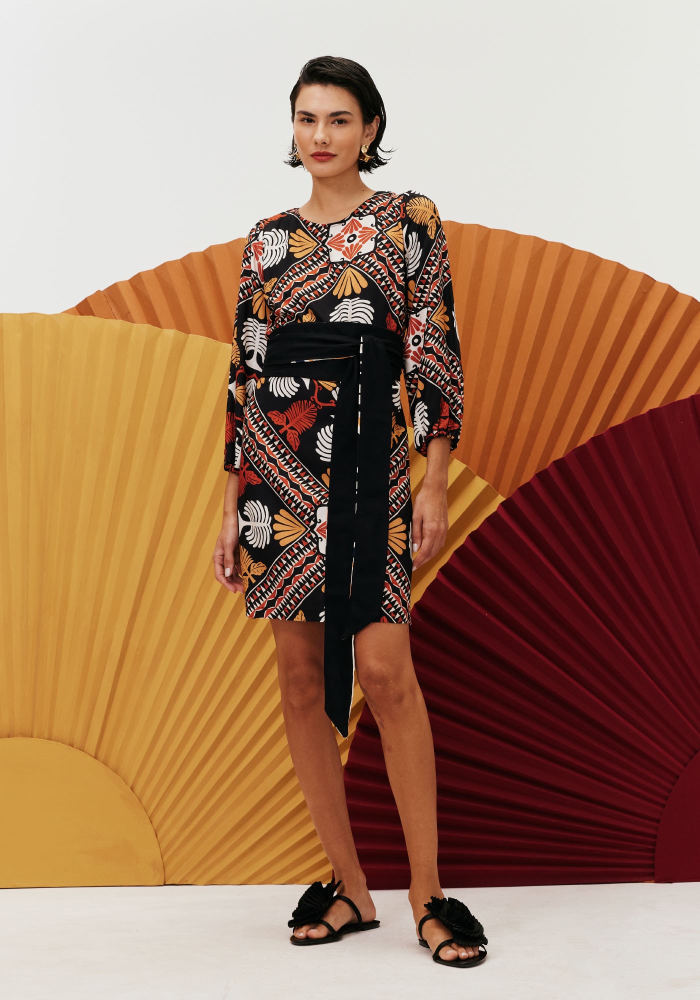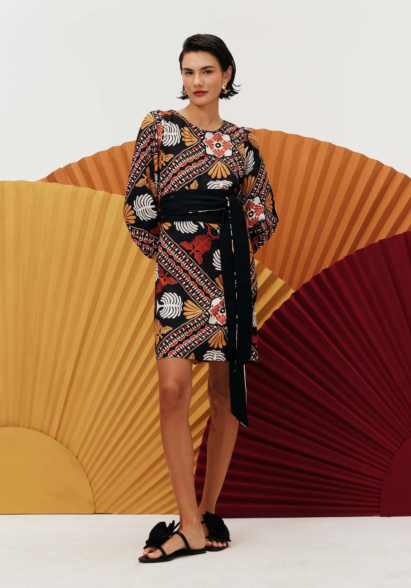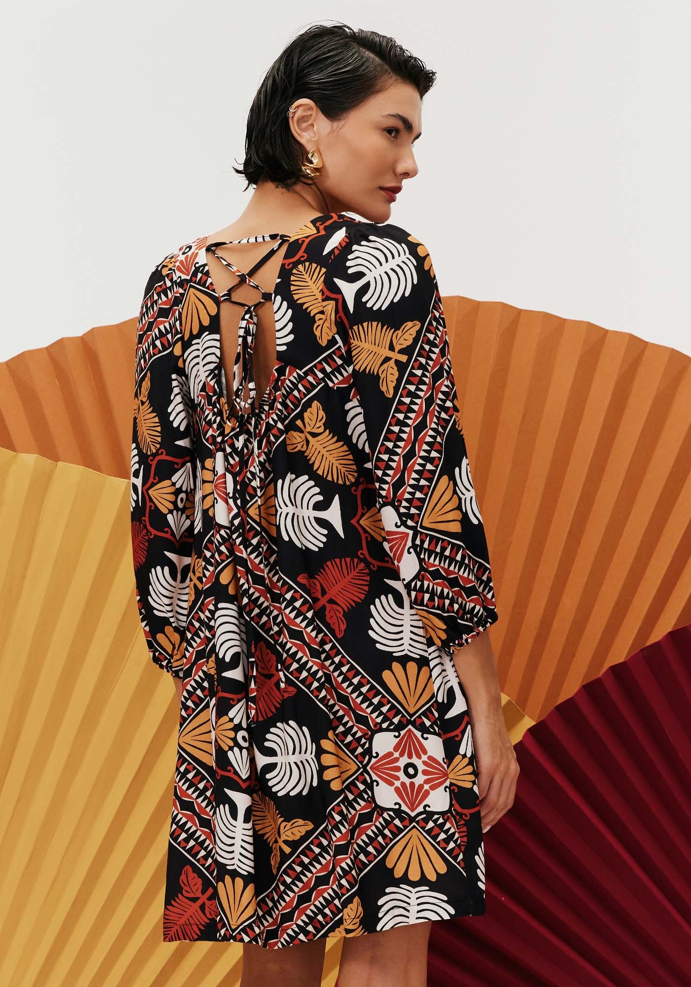 O vestido curto é ummodelo super elegante. Confeccionado em tecido 100% viscose, o modelo possuidecote alto redondo e manga longa bufante. O detalhe do decote cruzado nascostas é o que torna a peça a única.