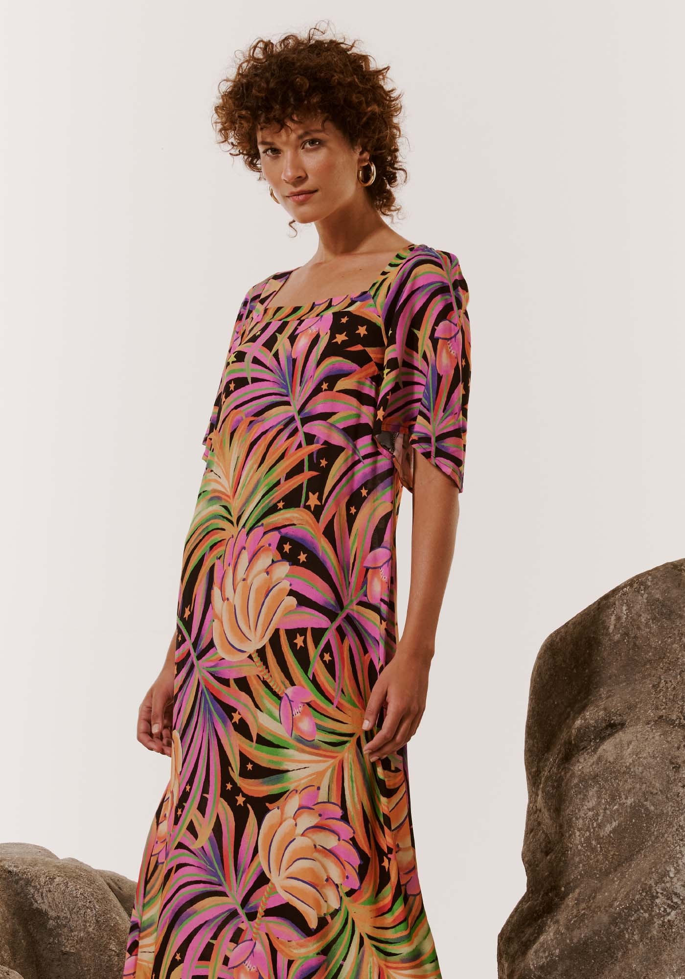 O vestido com decote quadrado é divertido e autêntico. Aestampa Lobeira tem cores vibrantes e mistura bananeiras e folhagens em umacombinação harmônica e moderna. Confeccionado em tecido 100% viscose, o modelolongo possui decote quadrado e a manguinha ampla.