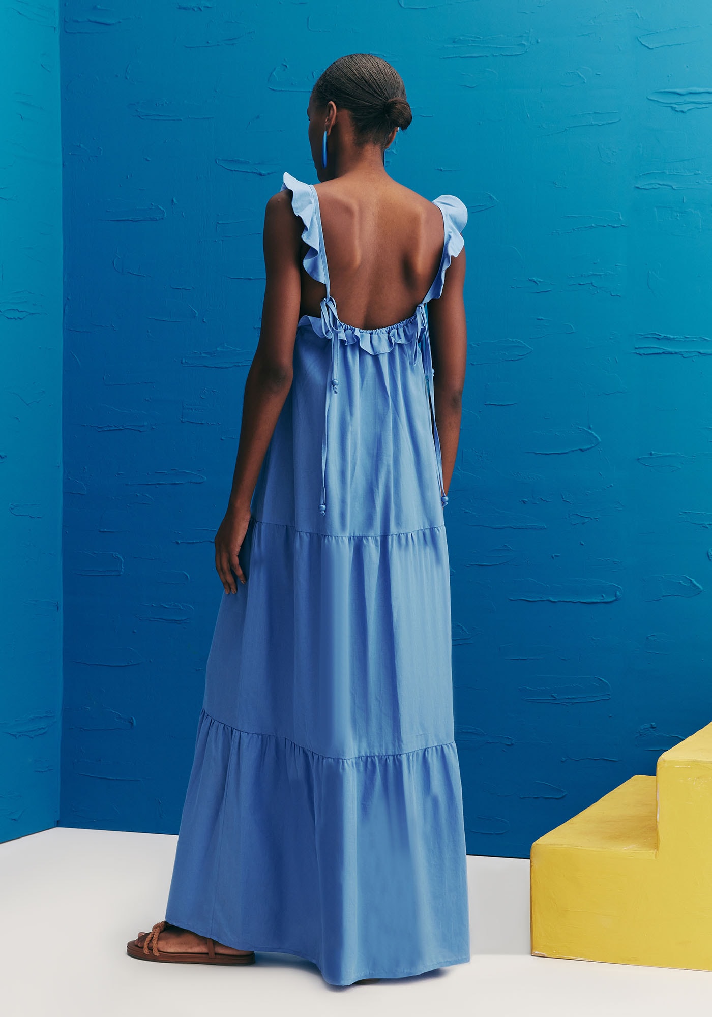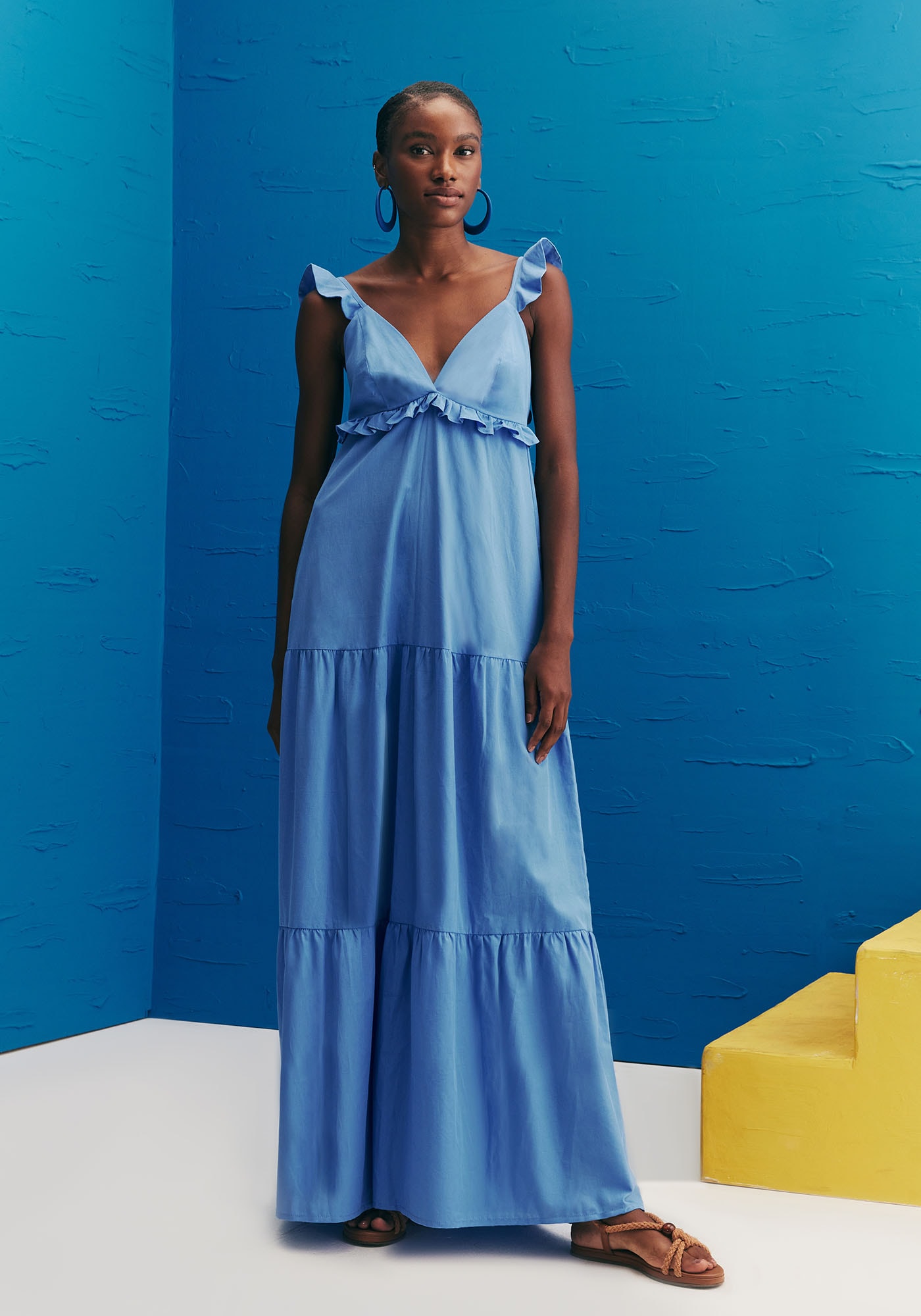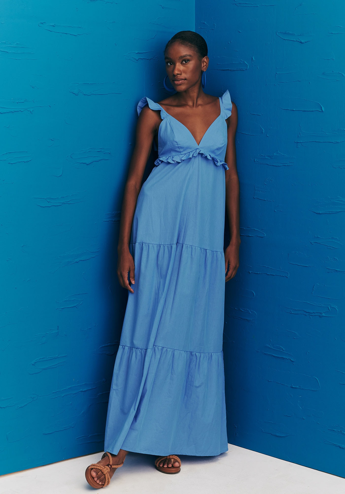Delicado e feminino, este vestidoé confeccionado em 100% algodão. Apresenta decote em V frontal que valoriza aregião do colo e sua saia é de modelagem ampla com três marias que proporcionamleveza e fluidez ao visual. Possui detalhe de babados abaixo do busto e nasalças trazendo um ar romântico para a peça.