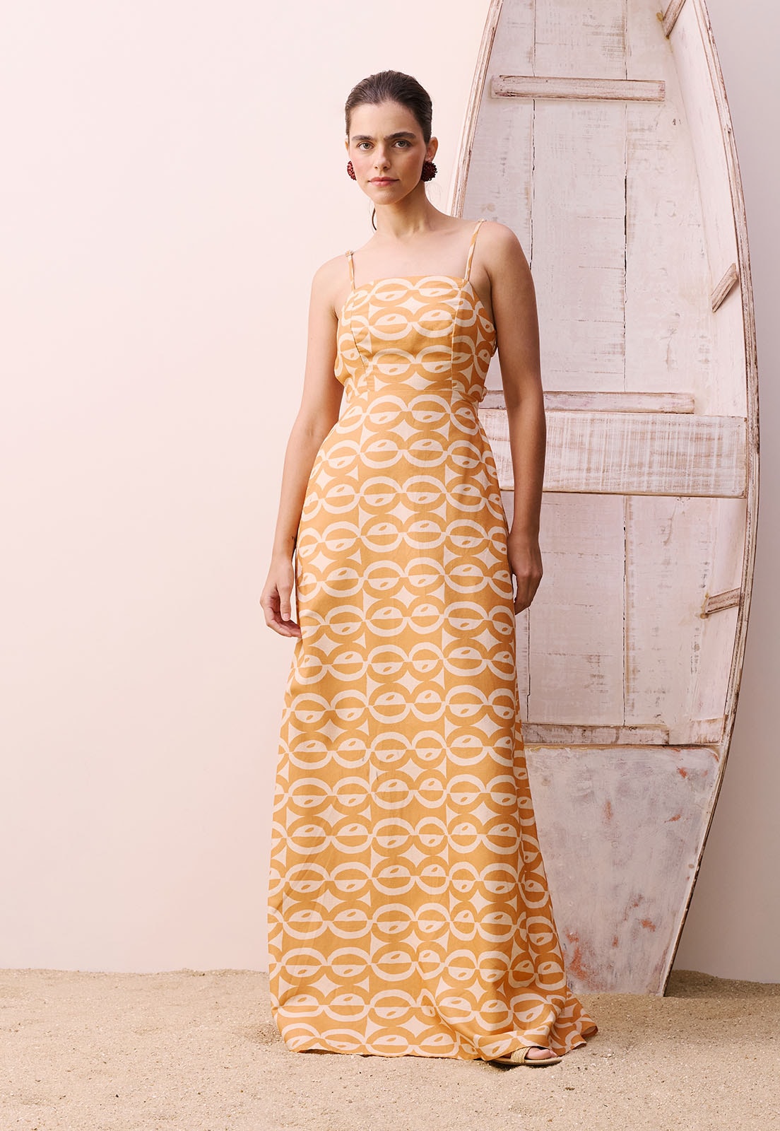 A saia longa e fluida proporciona movimento natural e conforto durante todo o uso, adaptando-se bem a diferentes biotipos como mostra a modelo de 1,77m vestindo o tamanho P. Este vestido combina perfeitamente com sandálias de tiras finas, brincos dourados e clutch minimalista, criando um visual sofisticado com pouco esforço.
