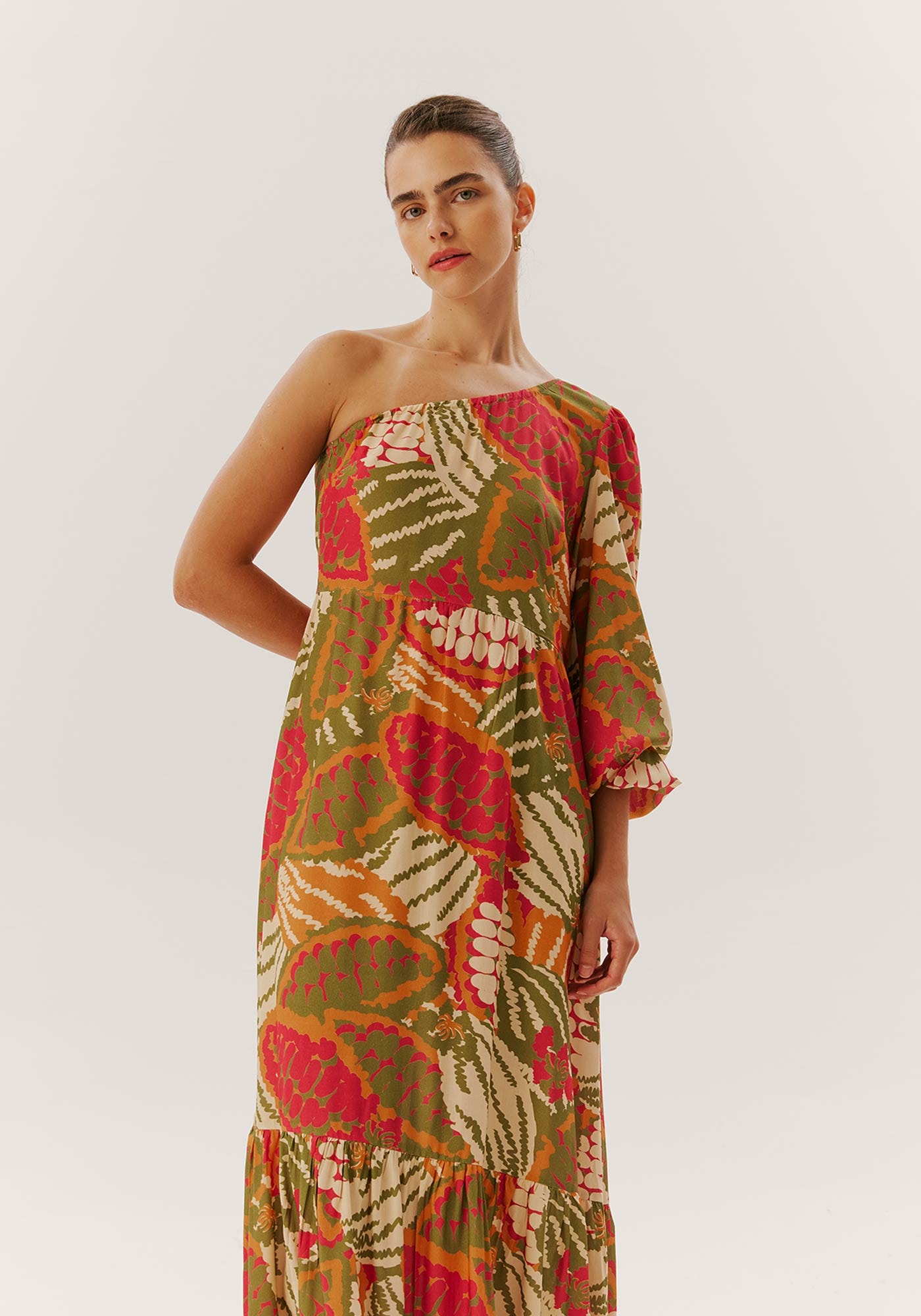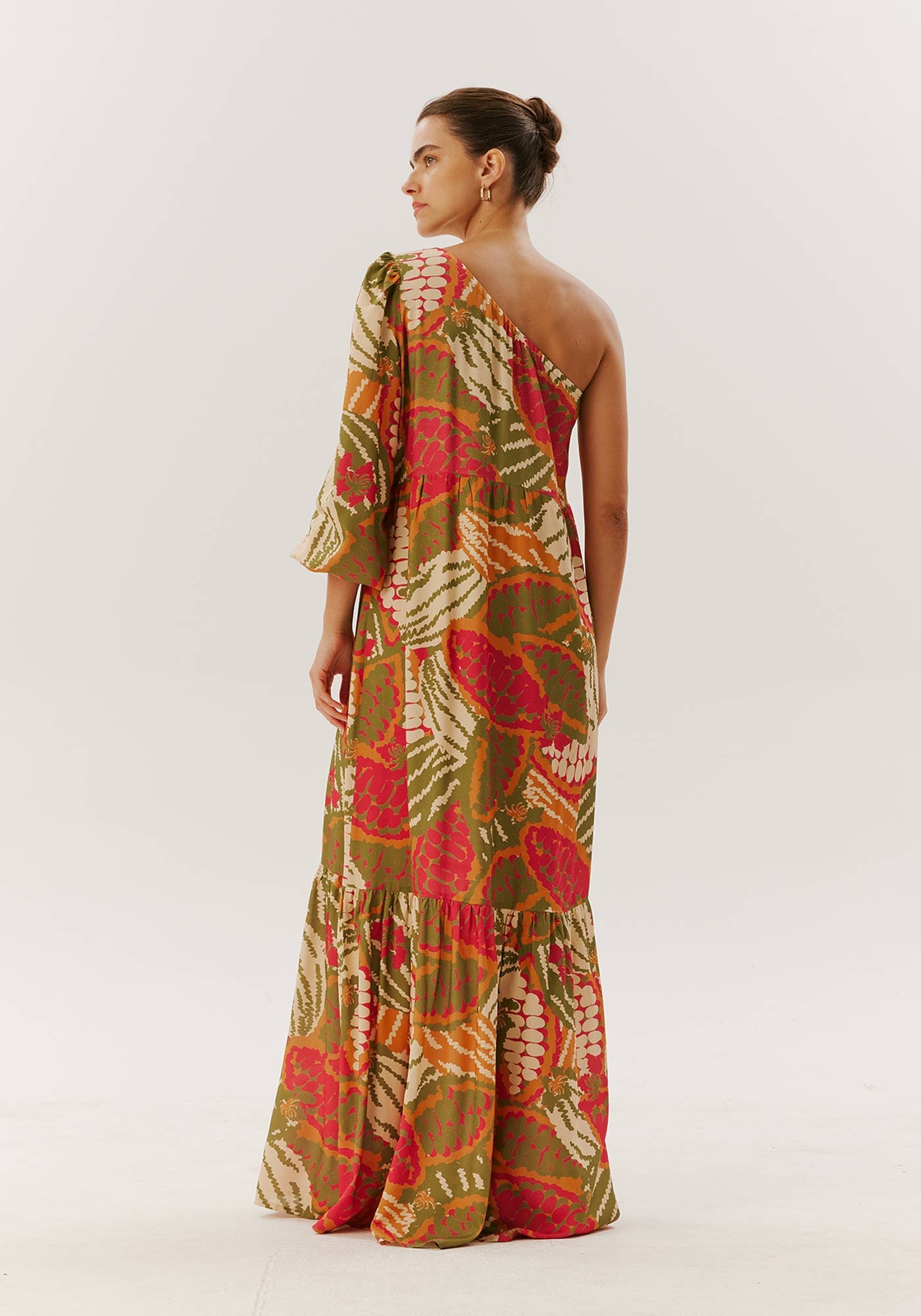 Encante-se com a sofisticação do nosso vestido feminino em 100% viscose. Seu design longo, acompanhado por uma manga longa única, confere um toque de elegância e estilo. A estampa vibrante, destacando desenhos da fruta cacau adiciona um toque tropical e fresco, perfeito para os dias de verão. Ideal para eventos especiais ou um passeio descontraído, este vestido é uma escolha versátil que combina conforto e moda. Seja a personificação da beleza em qualquer ocasião com esta peça.