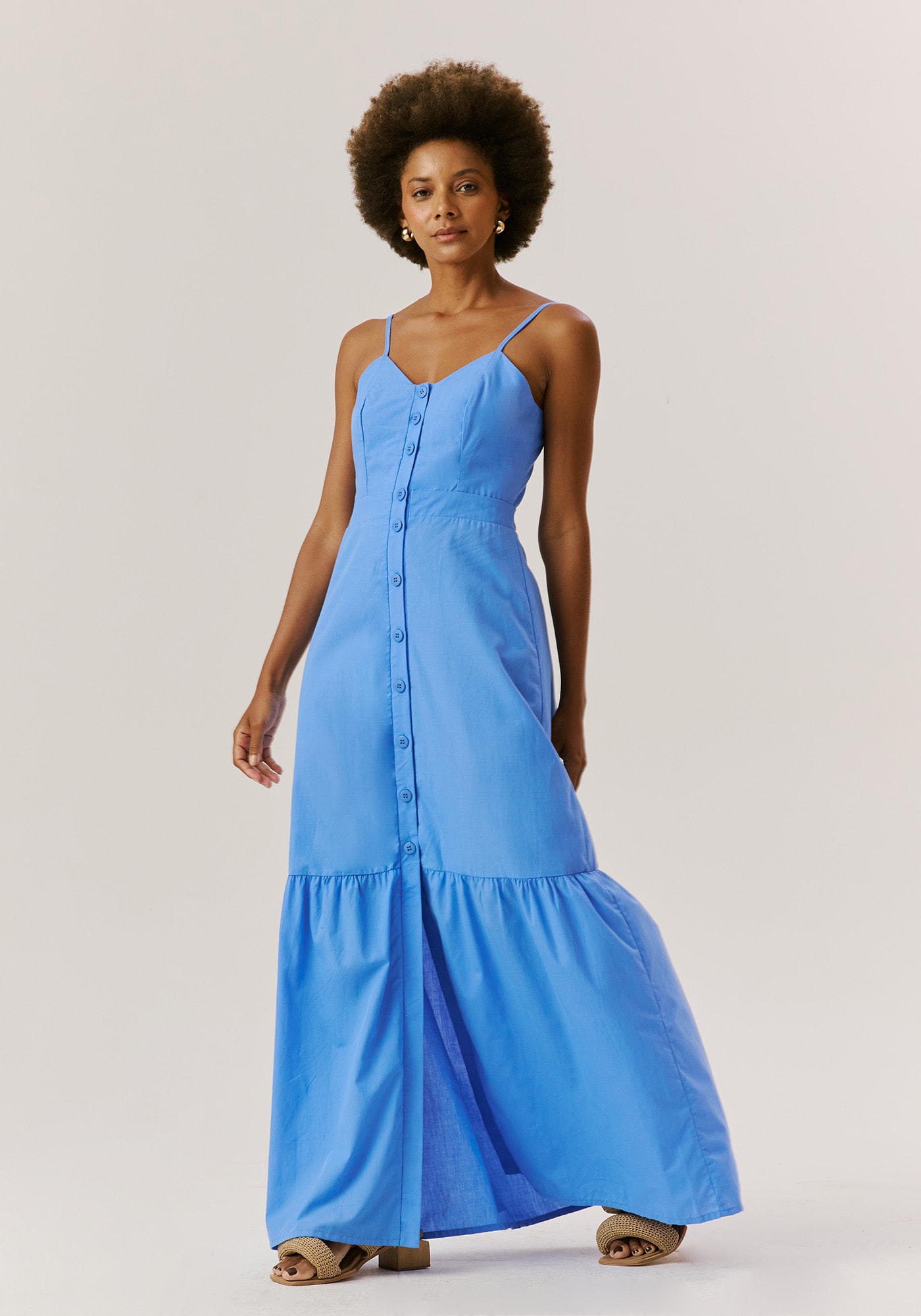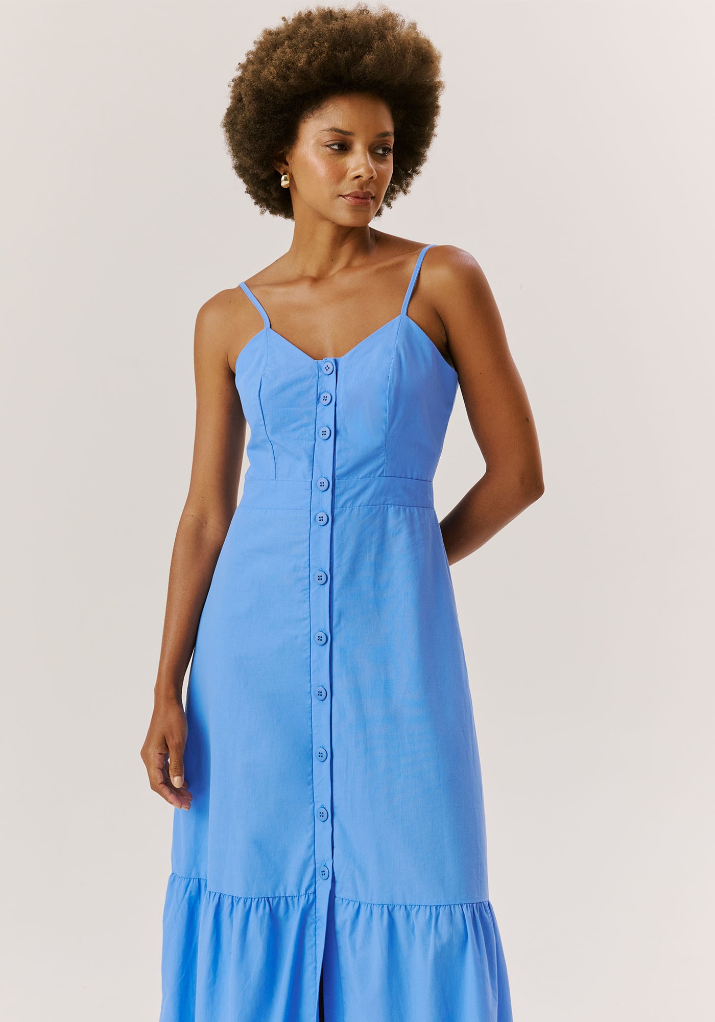 O vestido Longo com botões é a definição deelegância e feminilidade em uma peça. Confeccionado em 100% algodão, possuialças finas ajustáveis e decote coração que valoriza o busto de maneira sofisticada.O detalhe dos botões frontais acrescenta um charme à peça, enquanto o lastexnas costas garante um ajuste personalizado e confortável. Com uma maria na barra,que traz mais leveza e movimento, é o modelo ideal para eventos diurnos epasseios.