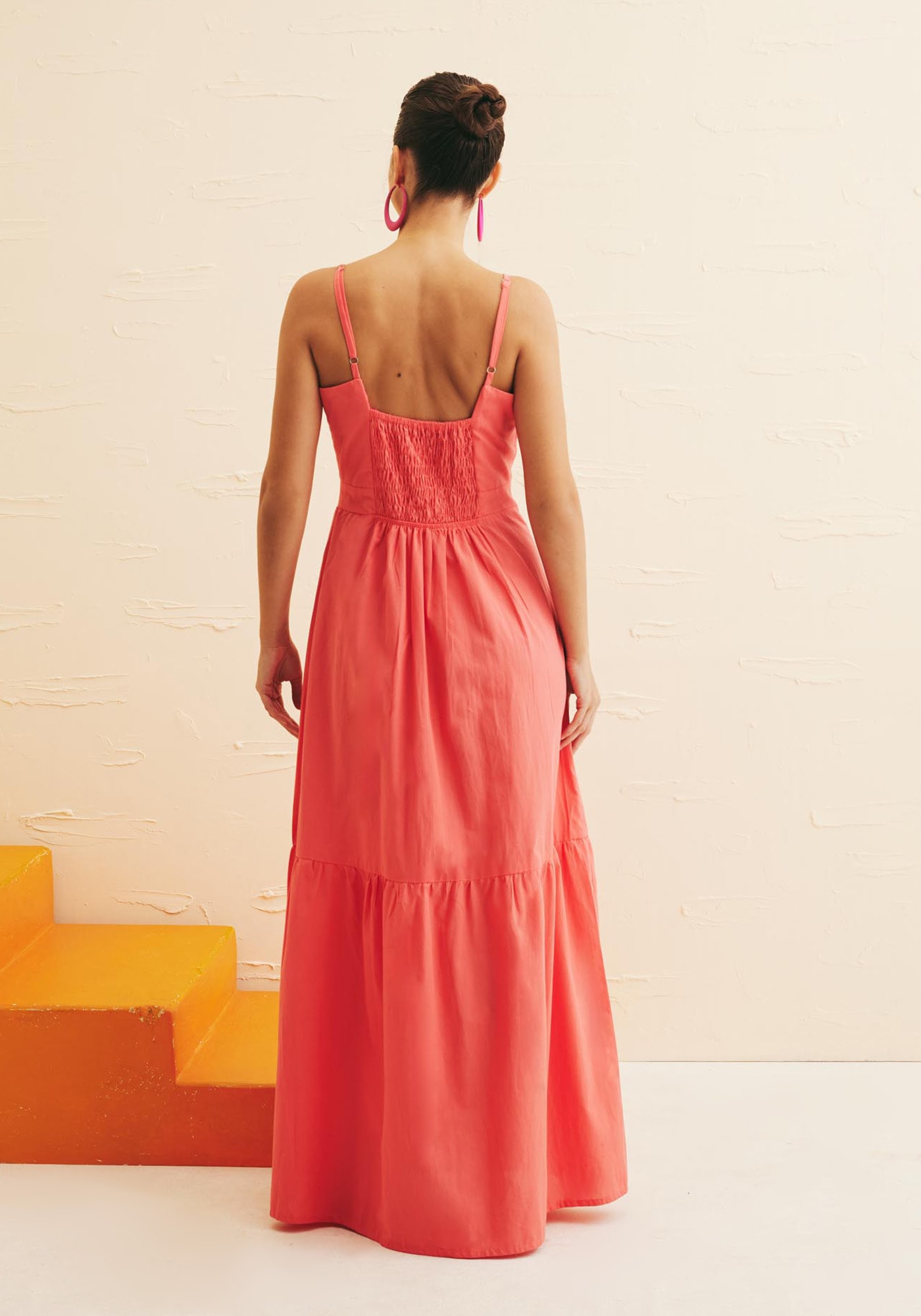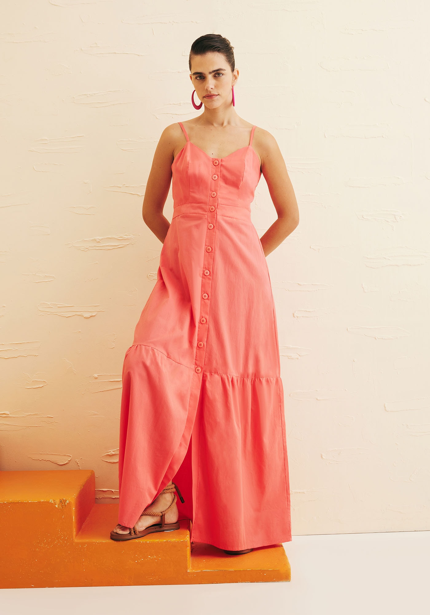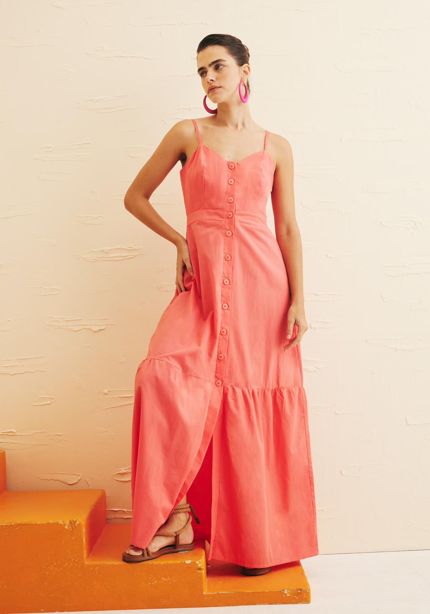 O vestido Longo com botões é a definição deelegância e feminilidade em uma peça. Confeccionado em 100% algodão, possuialças finas ajustáveis e decote coração que valoriza o busto de maneira sofisticada.O detalhe dos botões frontais acrescenta um charme à peça, enquanto o lastexnas costas garante um ajuste personalizado e confortável. Com uma maria na barra,que traz mais leveza e movimento, é o modelo ideal para eventos diurnos epasseios.