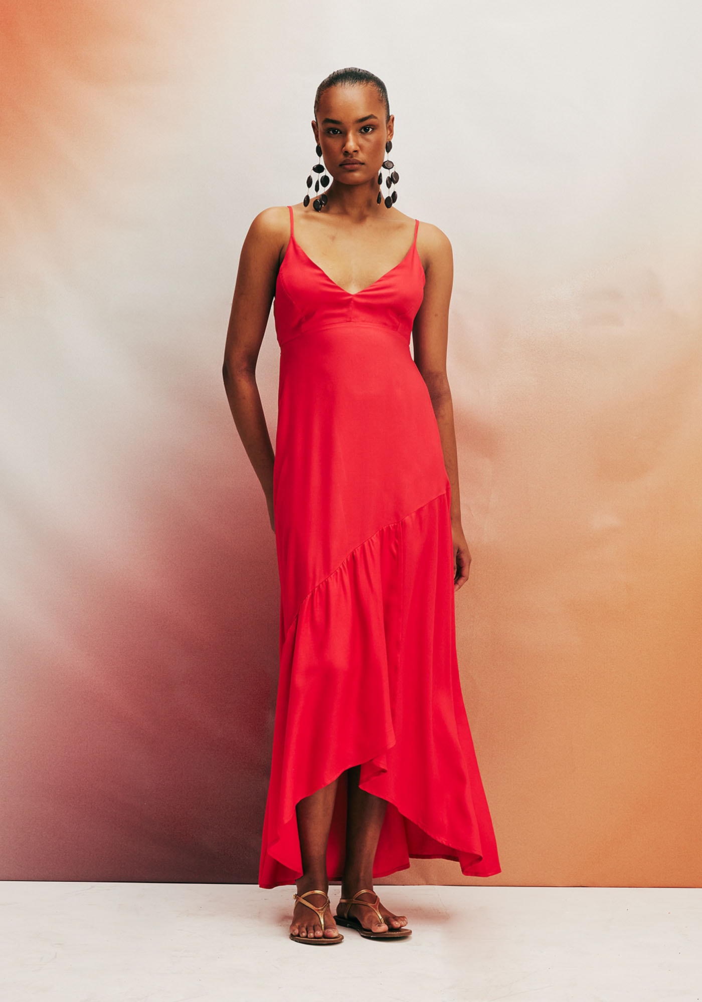 Confeccionado emviscose, este vestido longo apresenta alças finas com regulador, realçando umajuste personalizado. O decote em V e o busto ajustado conferem uma elegânciasofisticada. O comprimento amplo, detalhado com uma maria diagonal, adiciona umtoque encantador à peça.