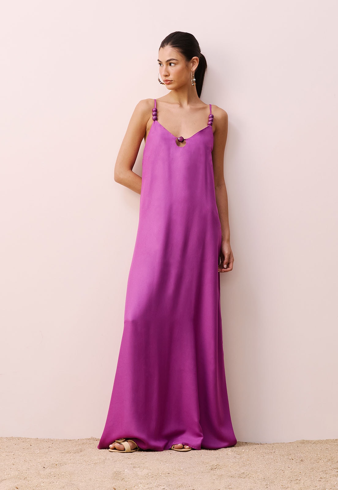 Descubra a leveza e a sofisticação do Vestido Longo Alça Ponteiras, uma peça que une elegância e conforto em cada detalhe. Com alças finas ajustáveis e ponteiras metálicas que adicionam um toque de charme, esse vestido é perfeito para compor looks versáteis, do passeio ao evento especial. O caimento fluido valoriza o movimento do corpo, enquanto o detalhe franzido nas costas proporciona um ajuste delicado e cheio de estilo. Confeccionado em 100% viscose, oferece frescor e maciez ao toque, ideal para os dias mais quentes.