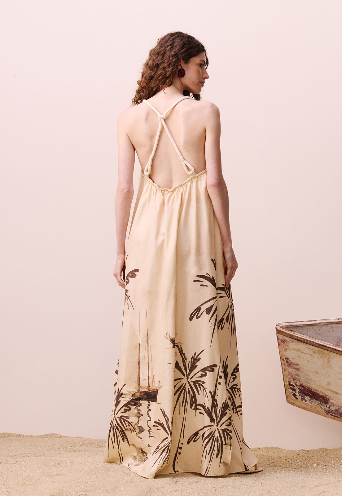 O Vestido Longo Aletas Estampado Navegar da CaCay é a escolha perfeita para quem busca leveza, sofisticação e um toque de natureza no visual. Com alças finas e decote reto, seu caimento fluido valoriza diferentes silhuetas, oferecendo conforto e liberdade de movimento. A estampa exclusiva, inspirada em elementos como palmeiras e barcos, transmite uma atmosfera serena e atemporal, ideal para ocasiões ao ar livre, encontros casuais ou momentos de descanso com estilo. A parte traseira aberta com alças cruzadas adiciona charme e frescor ao design, tornando-o uma peça versátil para climas quentes.
