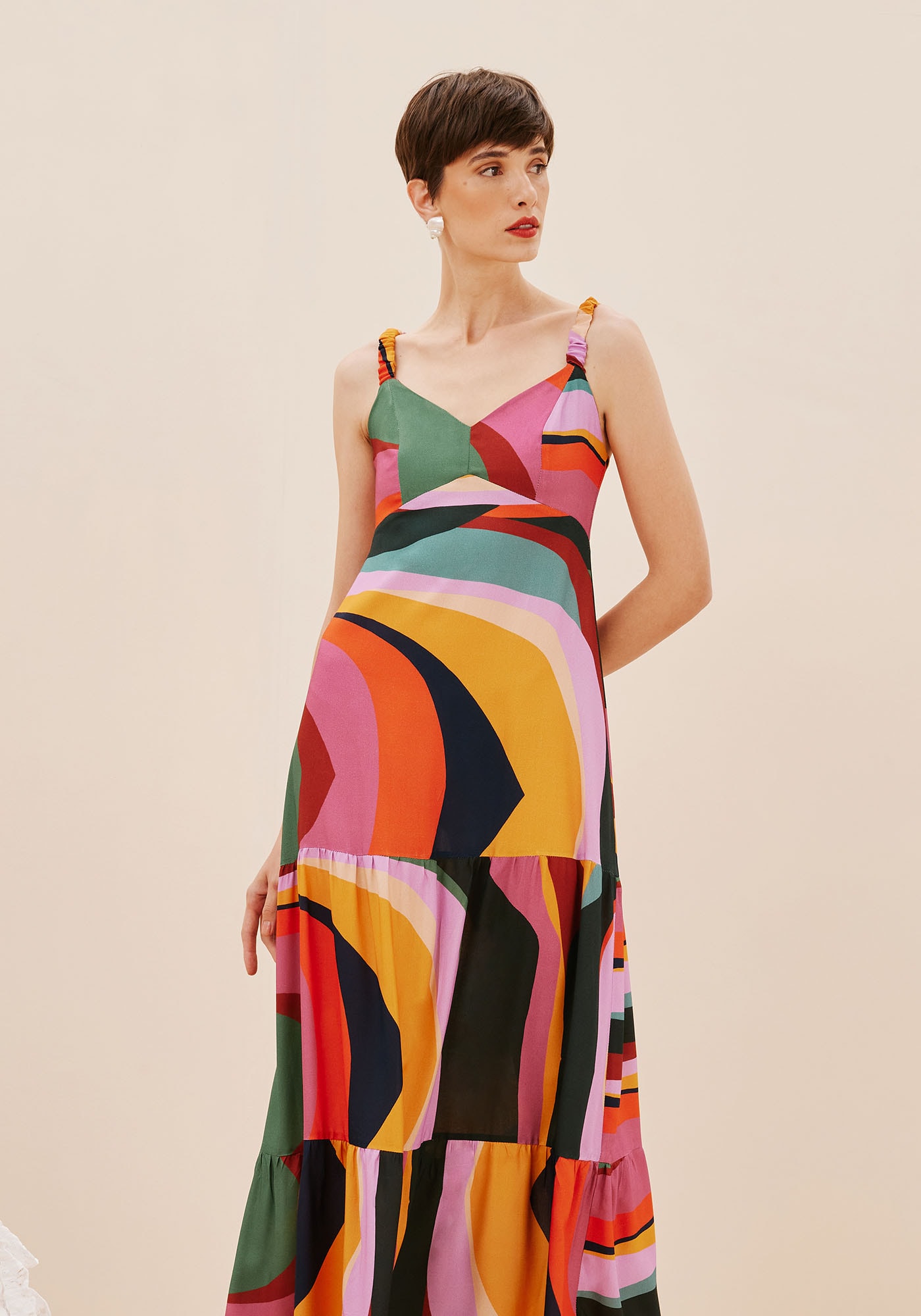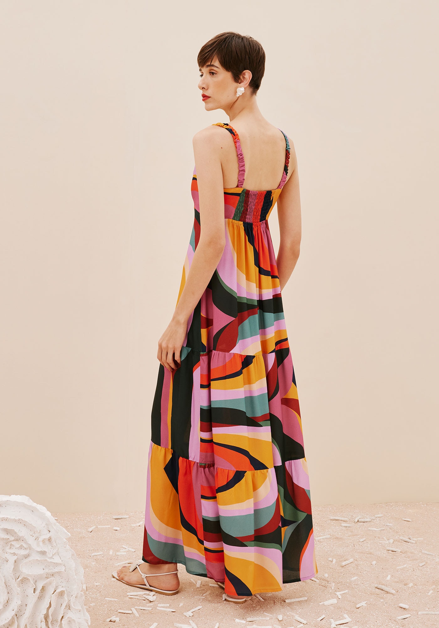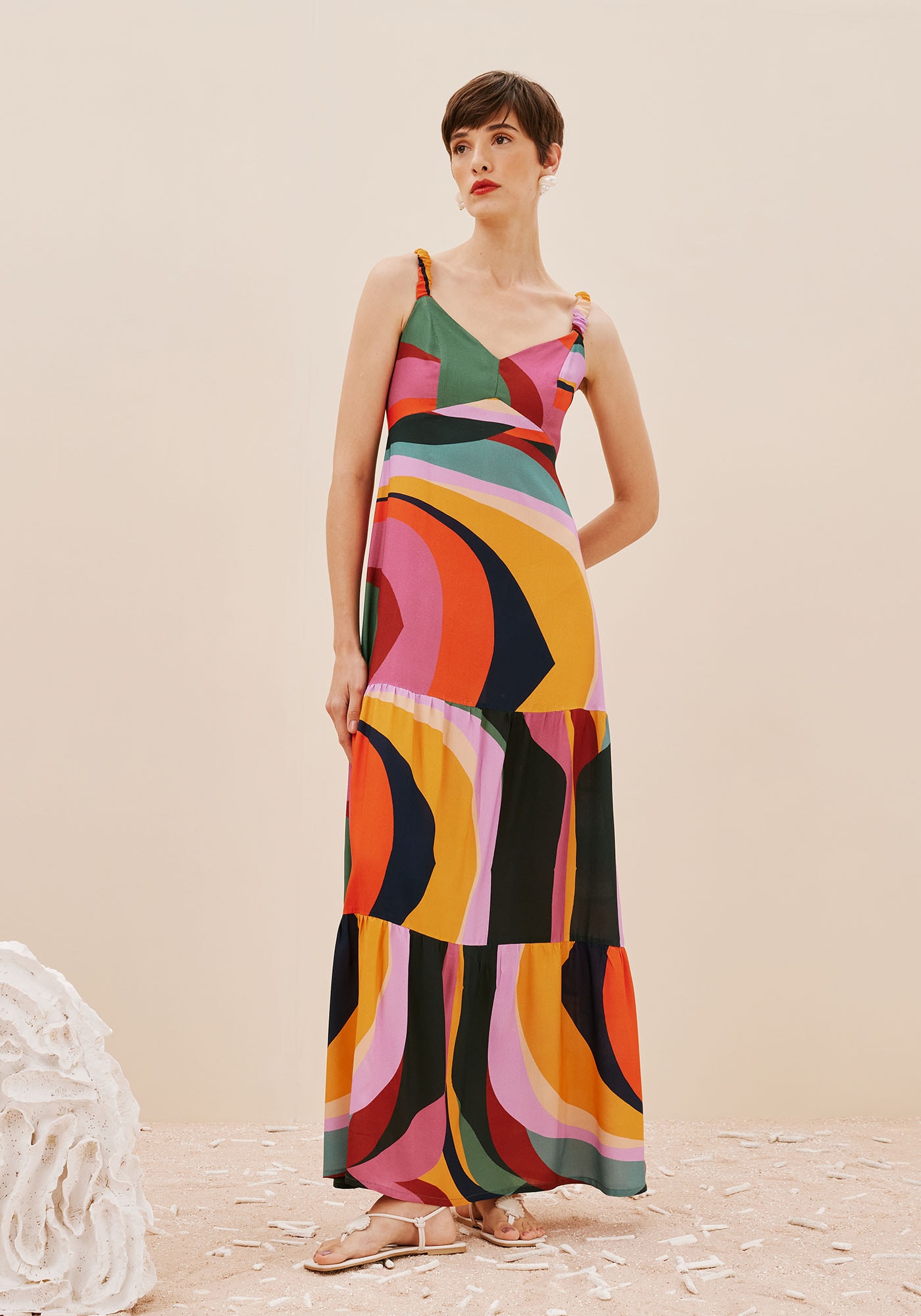 Com uma modelagem ampla e duasmarias na saia, o vestido longo traz fluidez e elegância para o seu visual.Este modelo apresenta um decote frontal em V e se destaca pela estampa Marésque proporciona modernidade. Possui lastex na parte das costas e também alçascom elástico para mais conforto e praticidade. É confeccionado em 100% viscose.