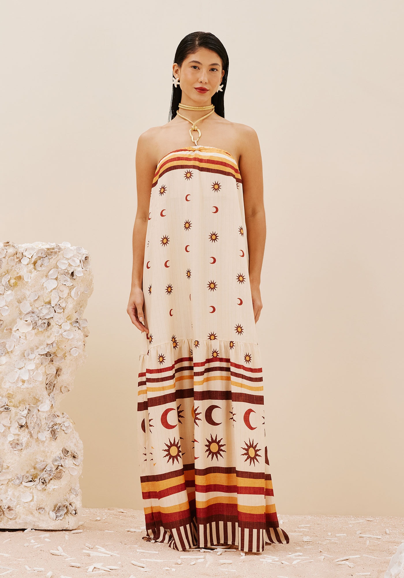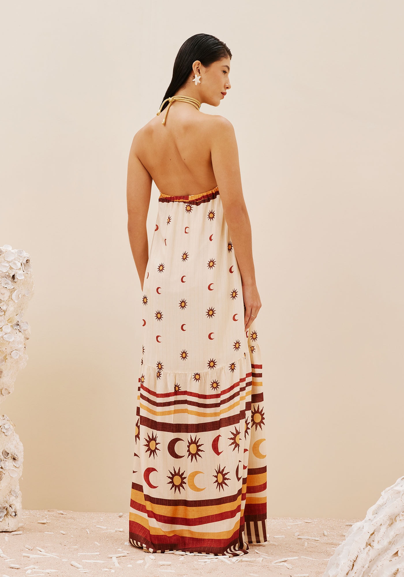 Este Vestido Longo Estampado é umverdadeiro destaque com sua argola dourada de formato orgânico que traz ao lookum charme único. O decote frente única com amarração no pescoço traz elegânciapara a peça enquanto o elástico nas costas garante segurança e conforto. A saiaampla e fluida com uma maria na barra proporciona movimento e leveza. Éconfeccionado em tecido de composição 99% Viscose e 1% Poliéster.