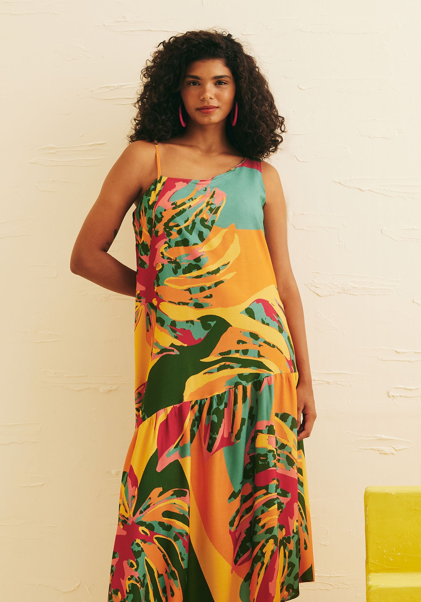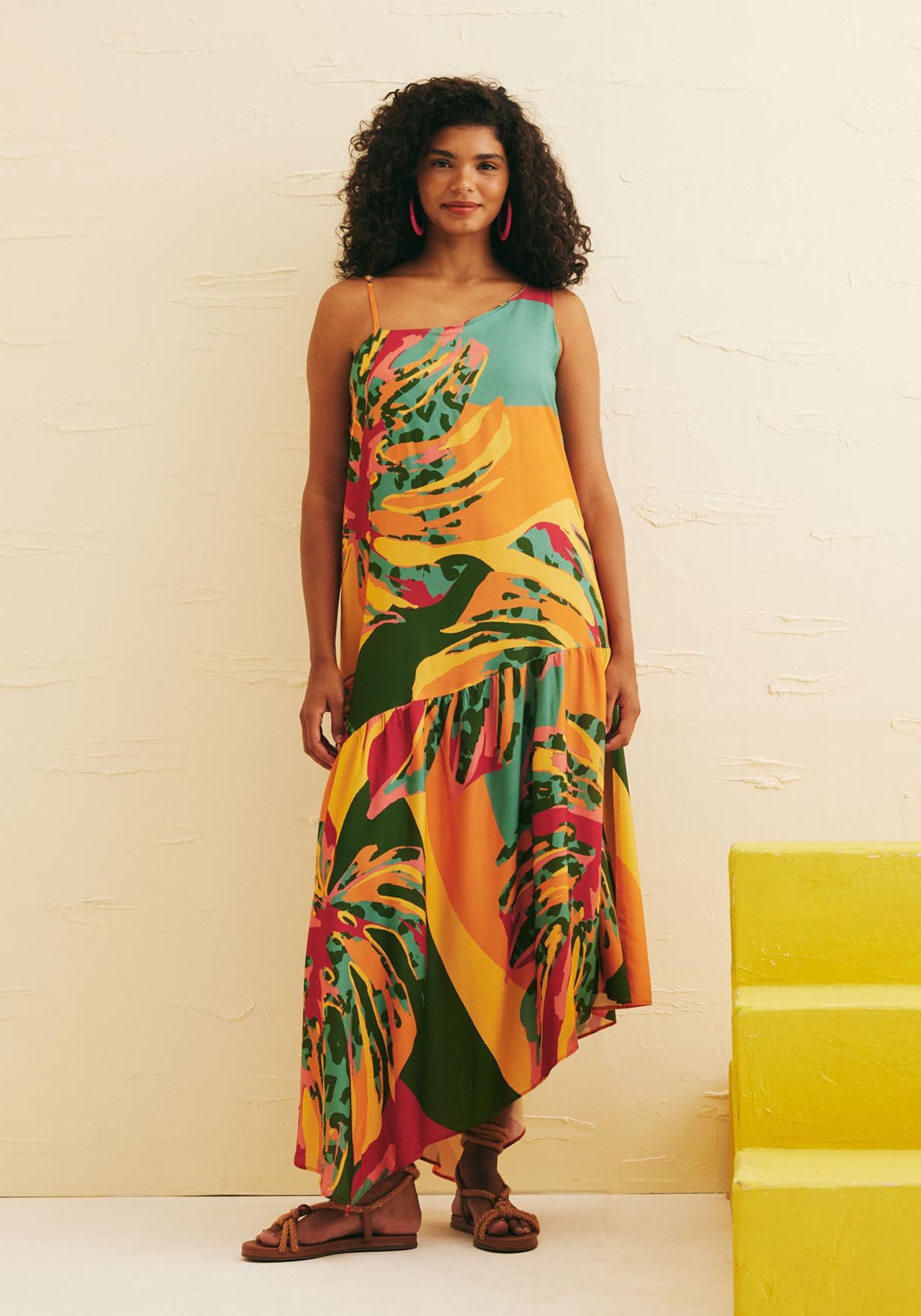Este vestido longocombina sofisticação e um design único. A peça apresenta uma alça fina e outramais larga criando um visual contemporâneo e original. A barra com mariaconfere movimento e singularidade. Confeccionado em 100% Viscose, é a escolhaideal para quem deseja se destacar com estilo e sofisticação.