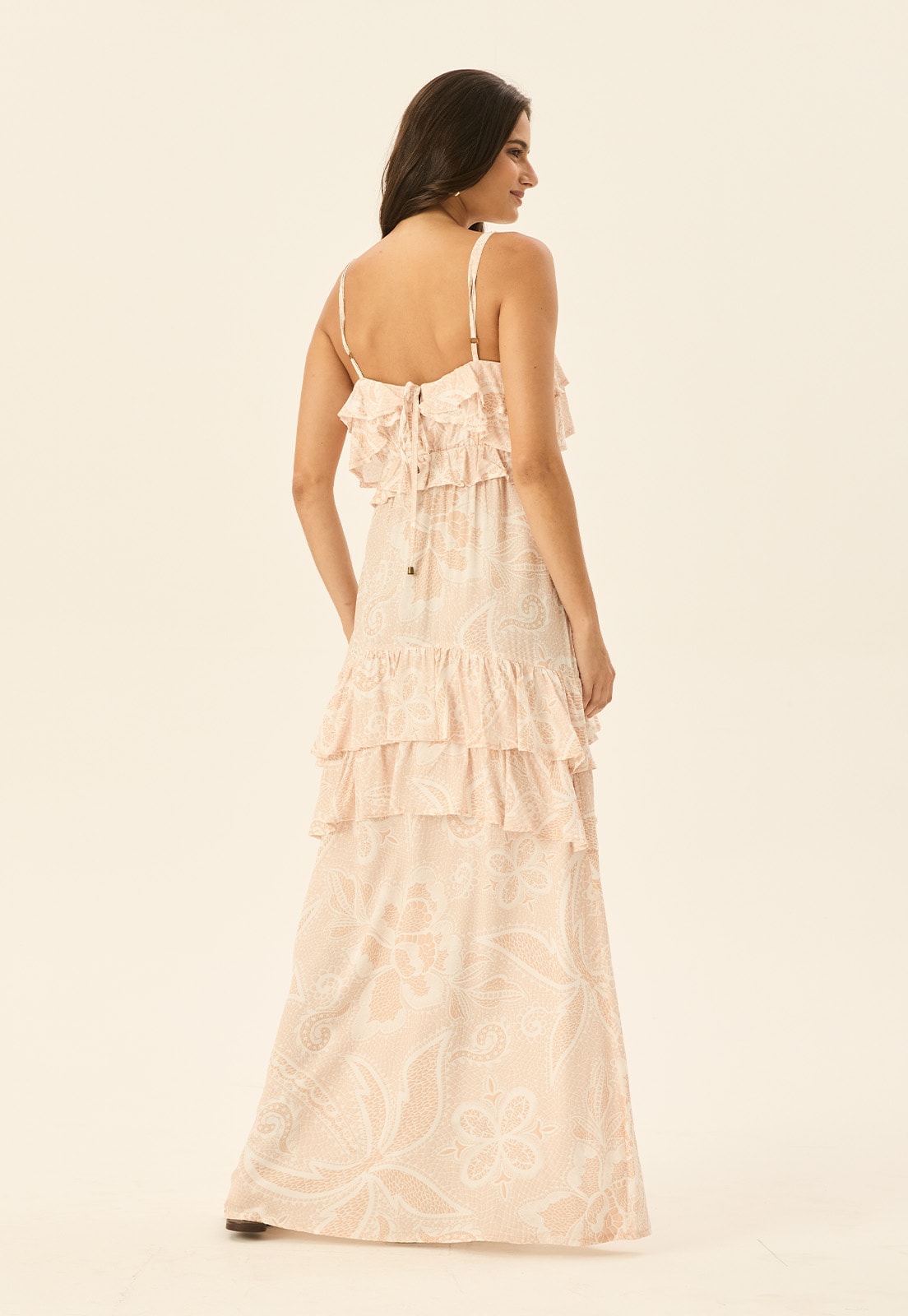 O Vestido Longo Babados Estampado Maracá da CaCay tem modelagem fluida e elegante, com caimento suave que acompanha o corpo sem marcar. Os babados em camadas trazem movimento e leveza, enquanto o busto ajusta com delicadeza graças às alças finas e ao recorte superior. A cintura é levemente solta, favorecendo o conforto, e o comprimento longo valoriza a silhueta com naturalidade. A forma é grande, então se você estiver em dúvida entre dois tamanhos, sugerimos optar pelo menor. Consulte a tabela de medidas para mais precisão. A modelo da foto tem 1,75 m, veste manequim 36 e está usando o tamanho P.