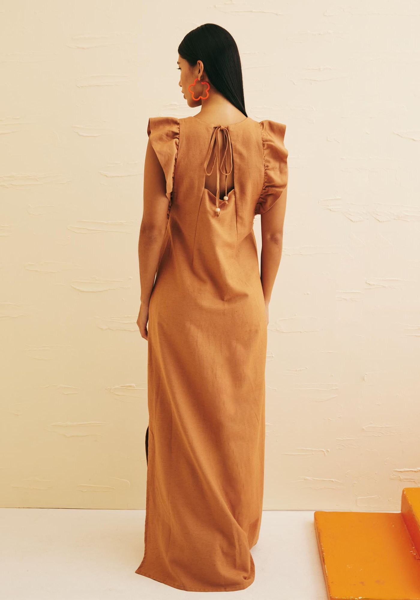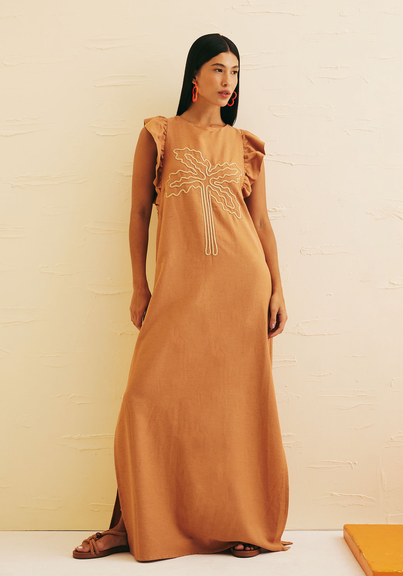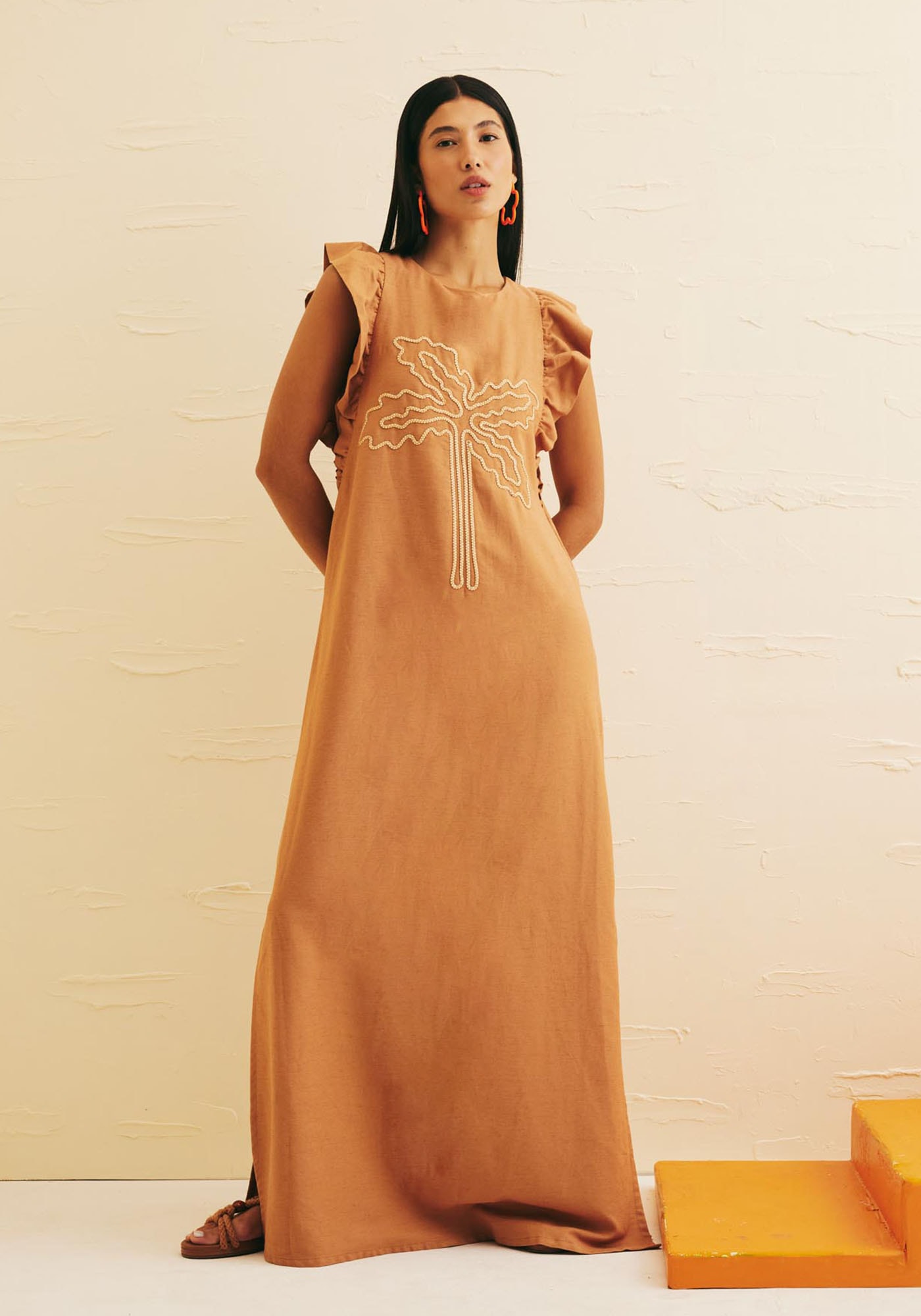 O vestido bordado é uma verdadeira obra de arte.Sofisticado, é confeccionado em tecido 42% algodão 38% viscose 14% modal e 6%linho e possui babado na manga, adicionando charme para a peça. O bordado,estrela do vestido, fica na parte da frente. A parte de trás contém um decote retangularfinalizado com amarração para dar mais segurança e conforto.
