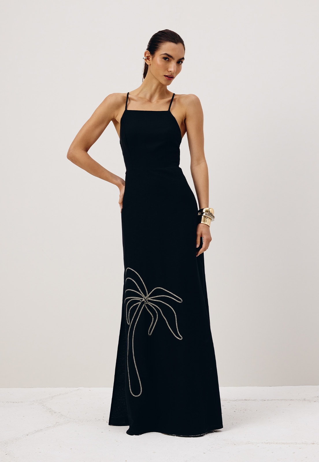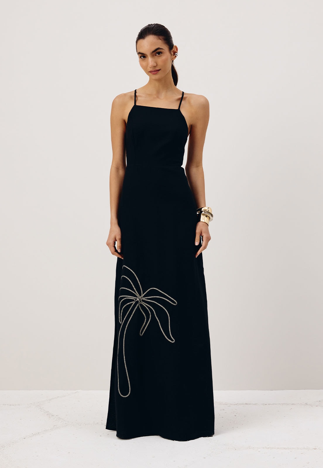 O vestido longoé um modelo elegante, confeccionado em tecido 70% algodão 30% viscose. O modelo possui decote alto com calça cruzada nas costas, detalhe que adiciona personalidade ao modelo. A cor lisa contrasta com o bordado de palmeira na barra.